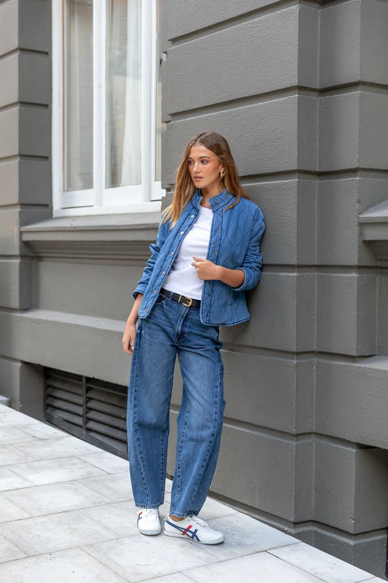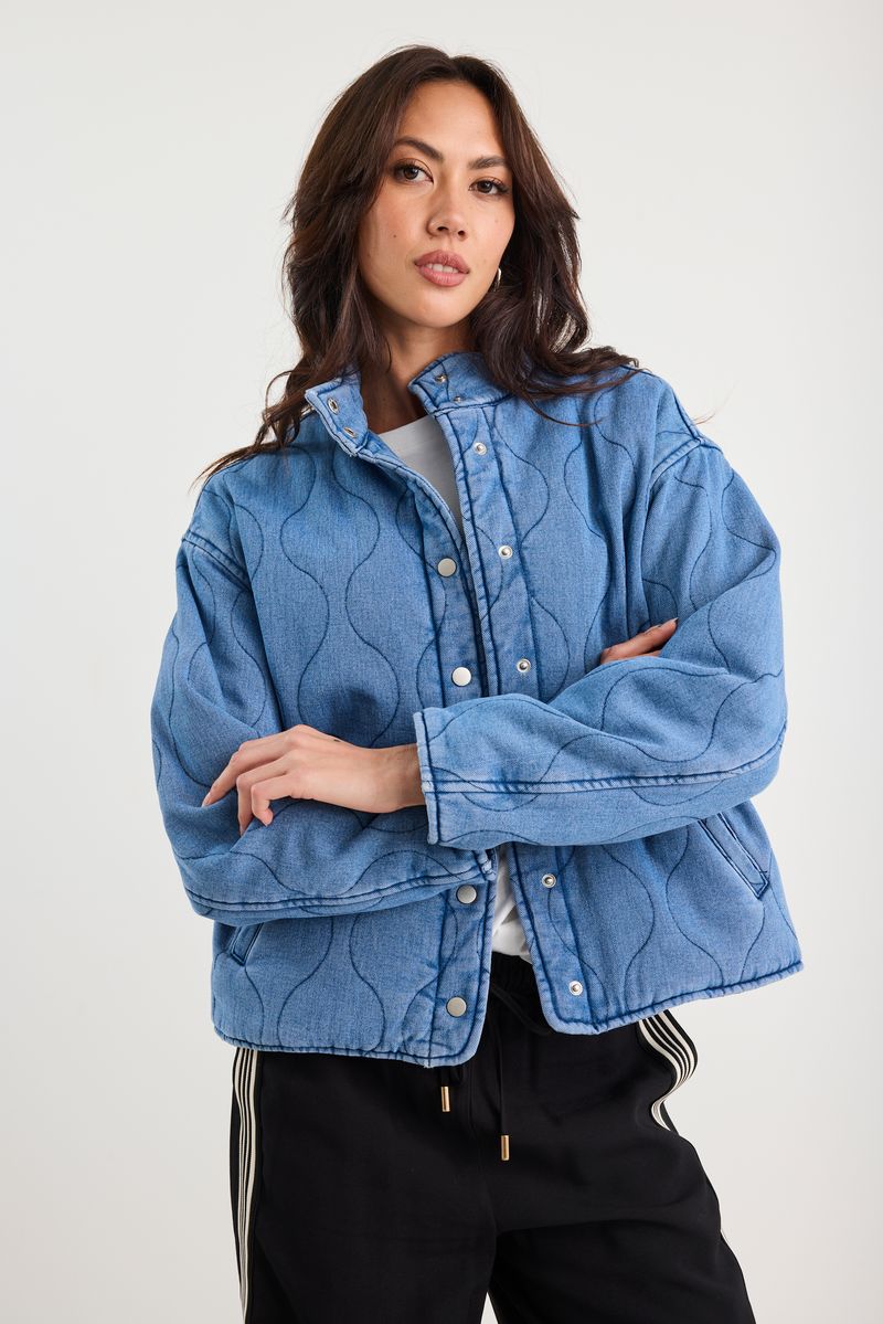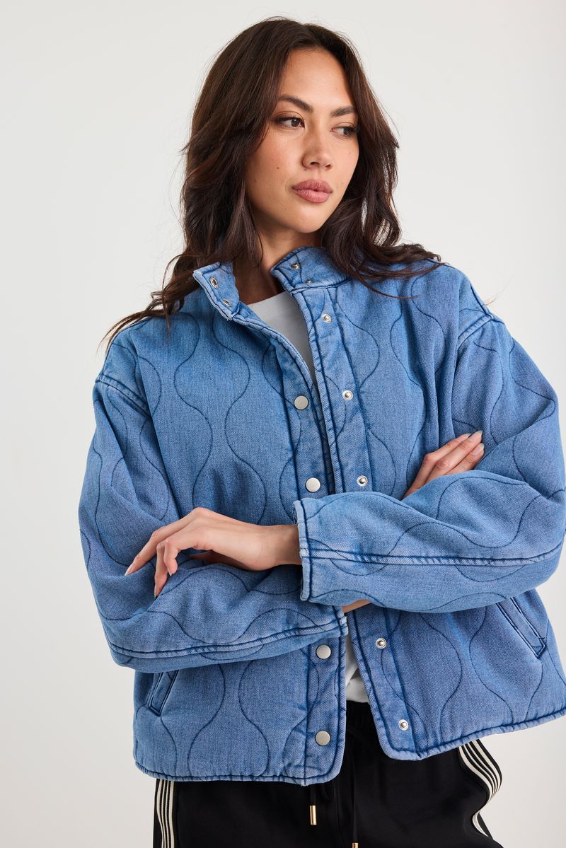 This statement quilted jacket brings a playful twist to classic denim. Crafted from 100% cotton, it features wave-style stitched quilting and an oversized silhouette for a laid-back yet elevated edge. The silver-tone snap buttons and soft lining make it ideal for transitional layering.