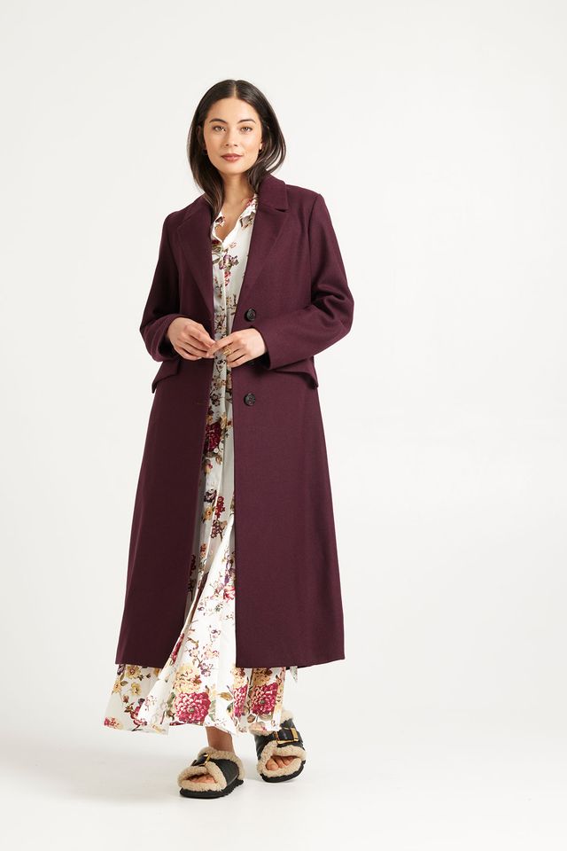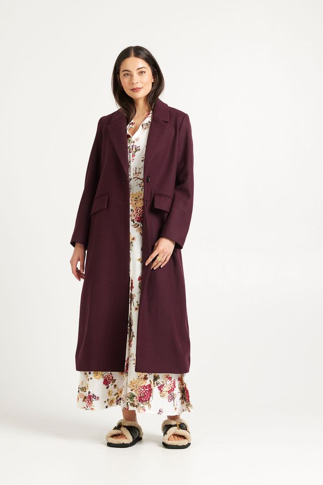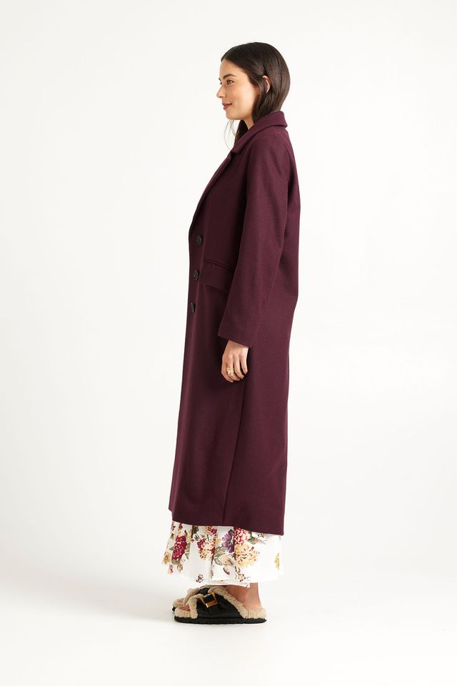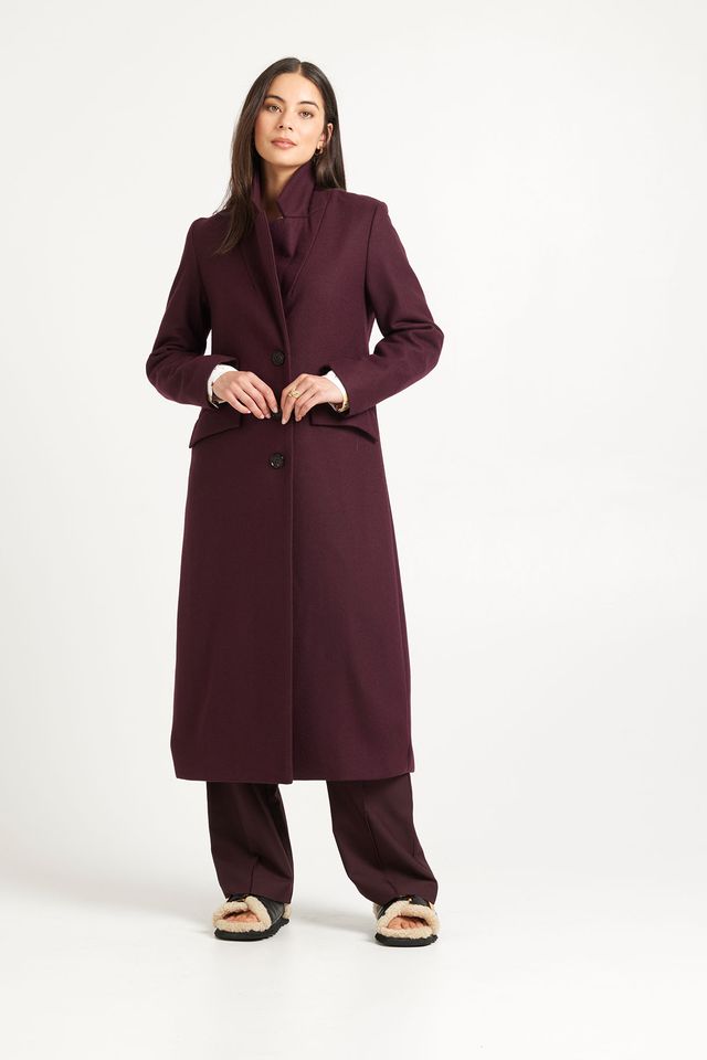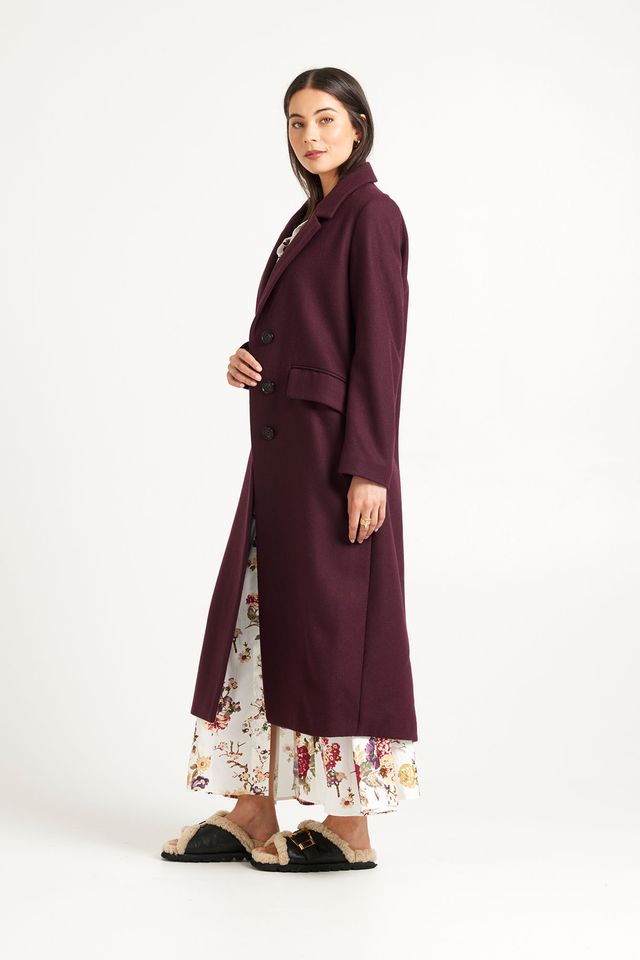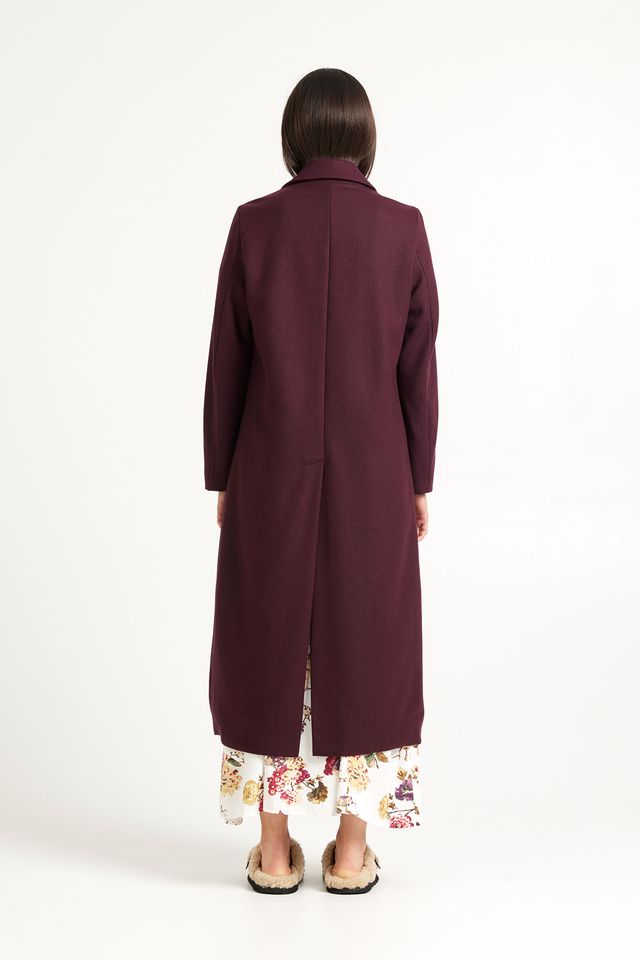 This rich, deep burgundy toned wool coat is truly stunning. An iteration of our famous Saskia Coat shape, the tailored fit is incredible and the merlot colour is seriously divine. A winter coat like no other.