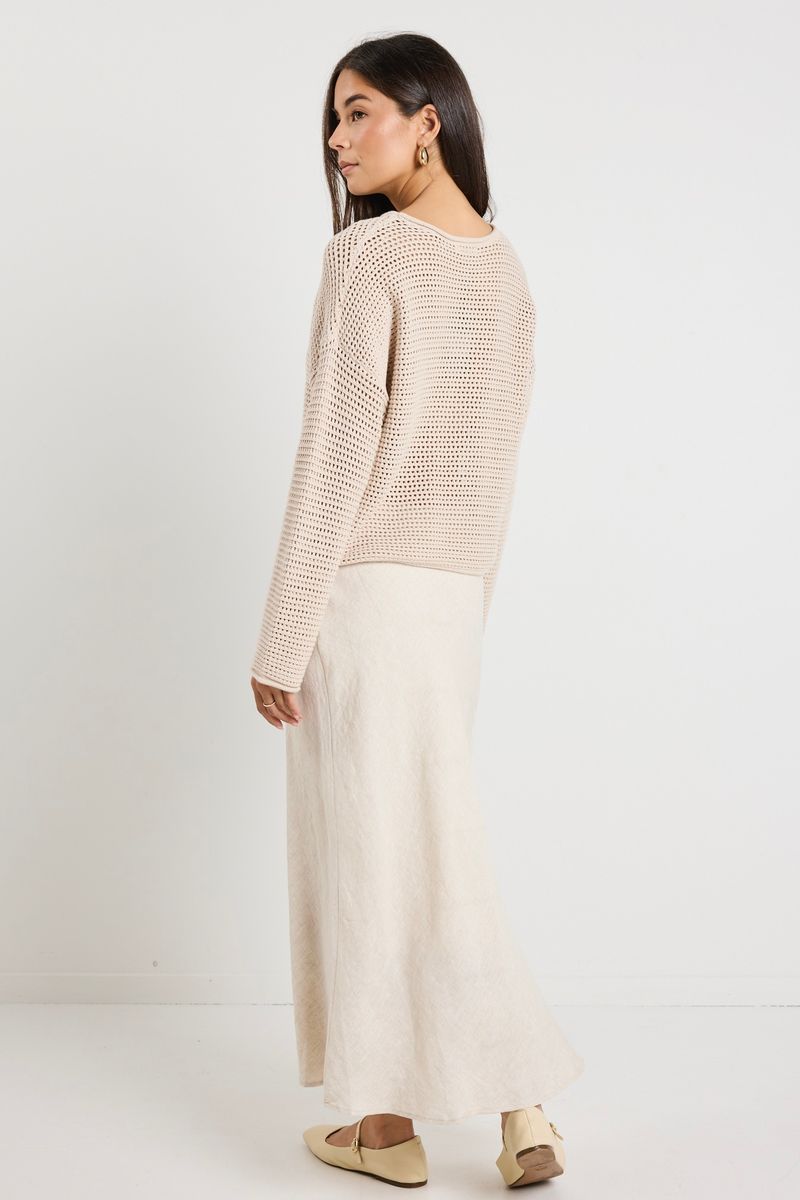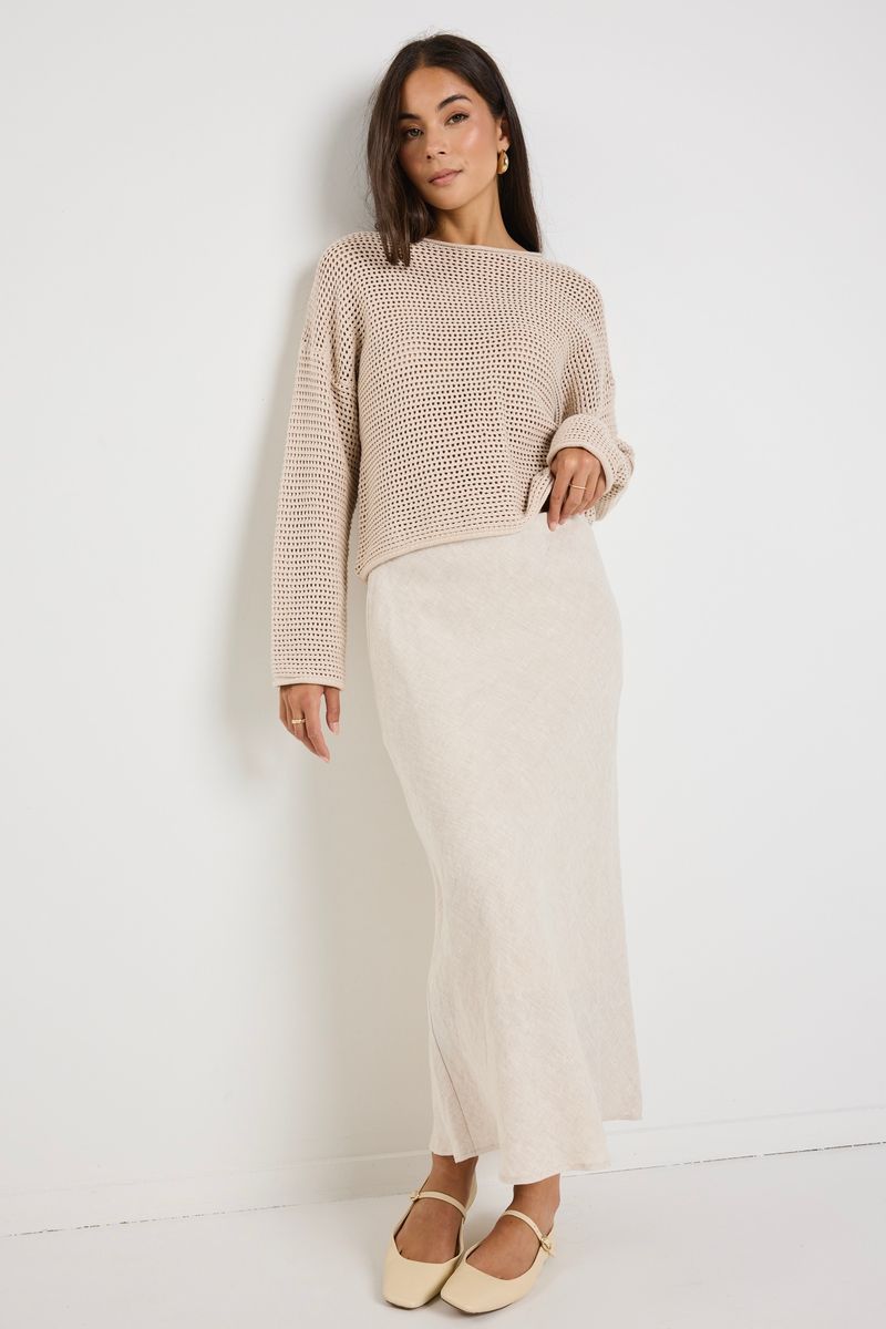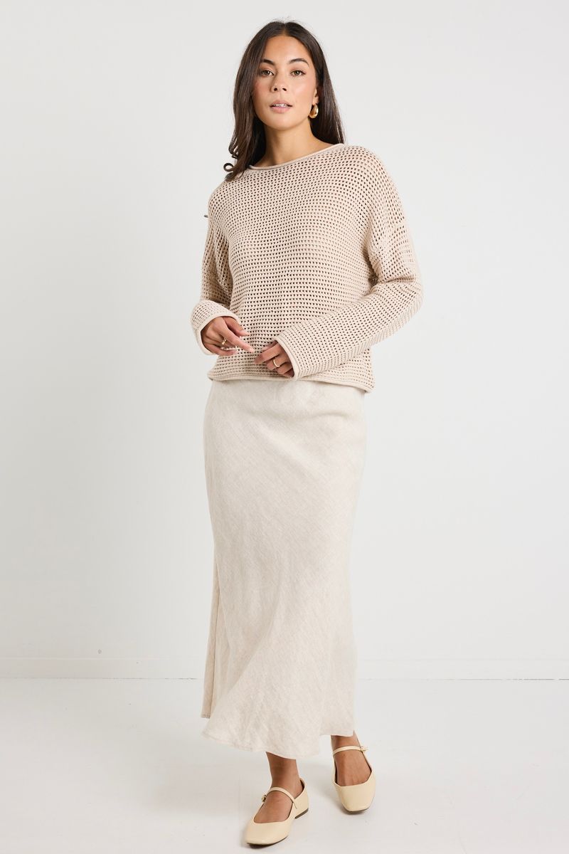 A fresh take on the classic bias midi skirt, the RE: Union Label skirt features self-covered buttons and 100% soft linen. A perfect transition piece from work to date night, this stunning skirt can easily be dressed up for any occasion.