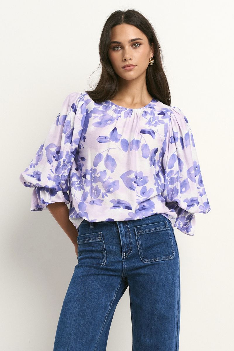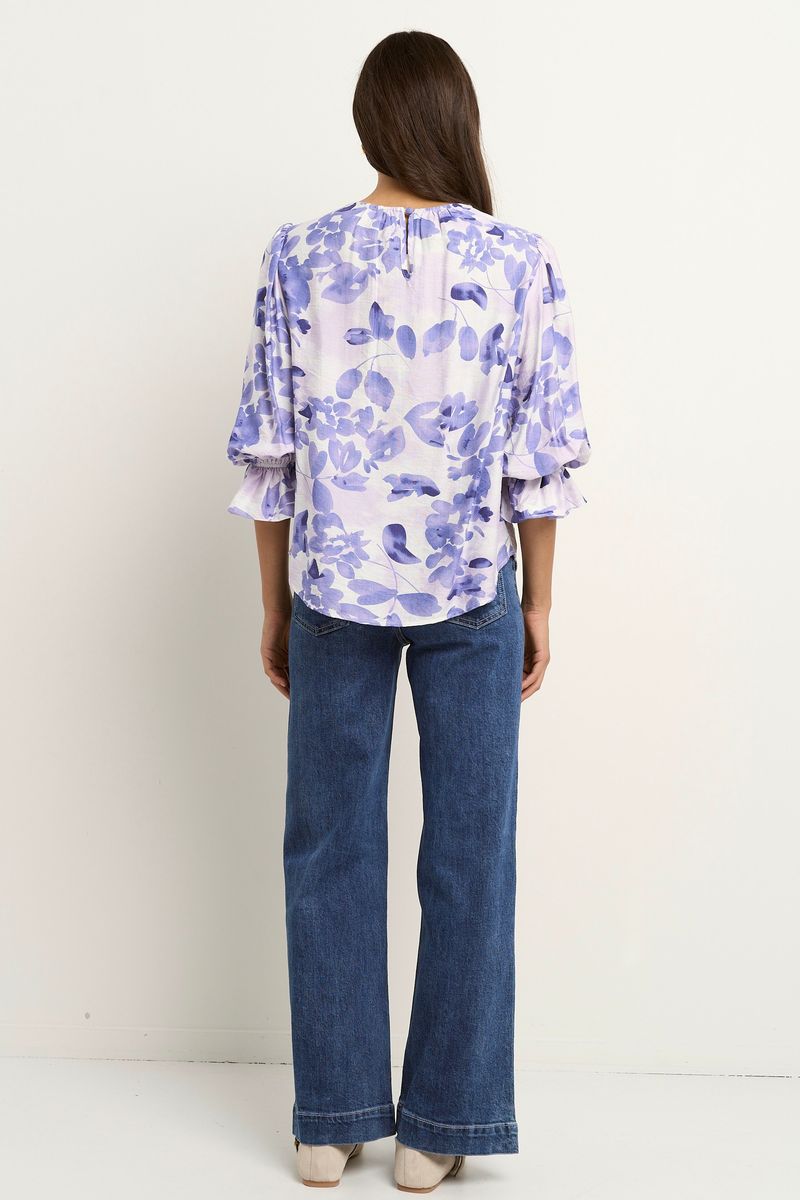 Candid Frill Sleeve Crew Neck SS Top – Ivory Blue Floral