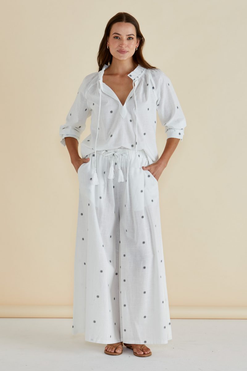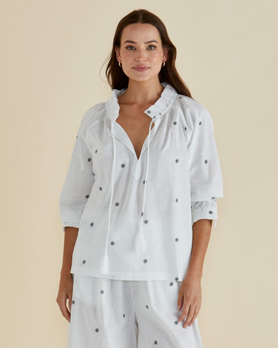 The Charli Blouse combines handwoven cotton with an open V-neckline and tie neck detail for an elevated silhouette. Raglan sleeves and relaxed fit add effortless comfort. A sophisticated and classic piece perfect for transeasonal layering.