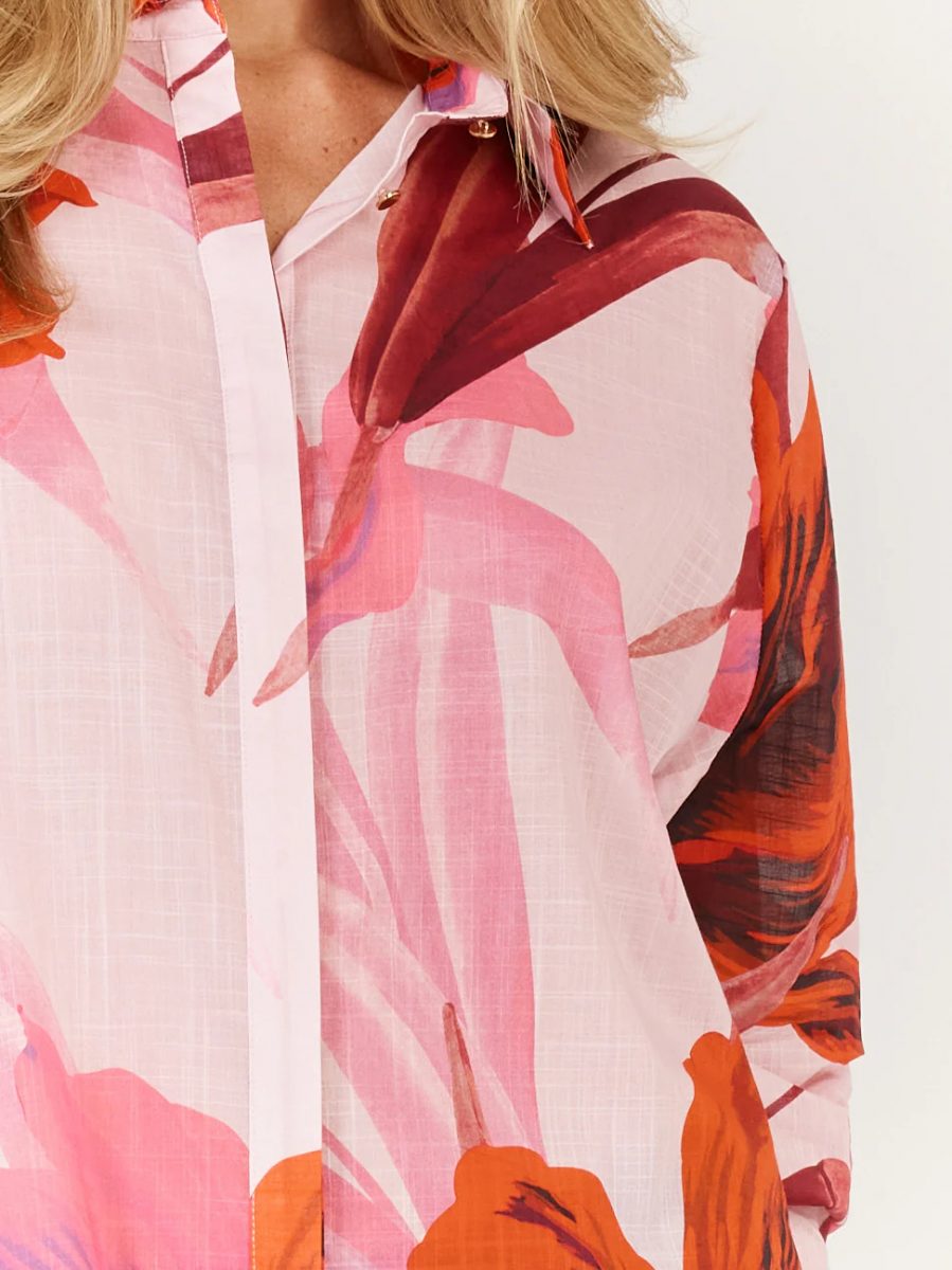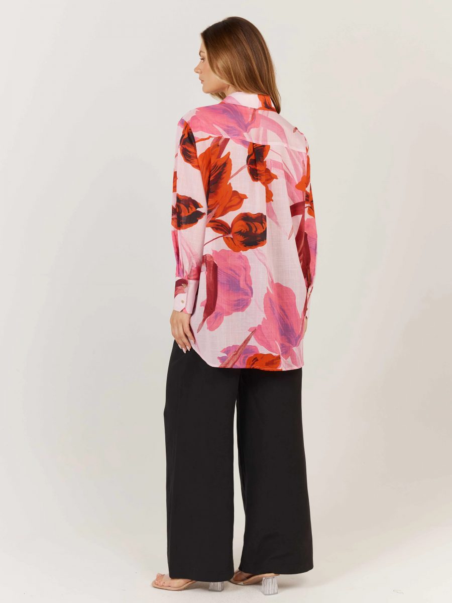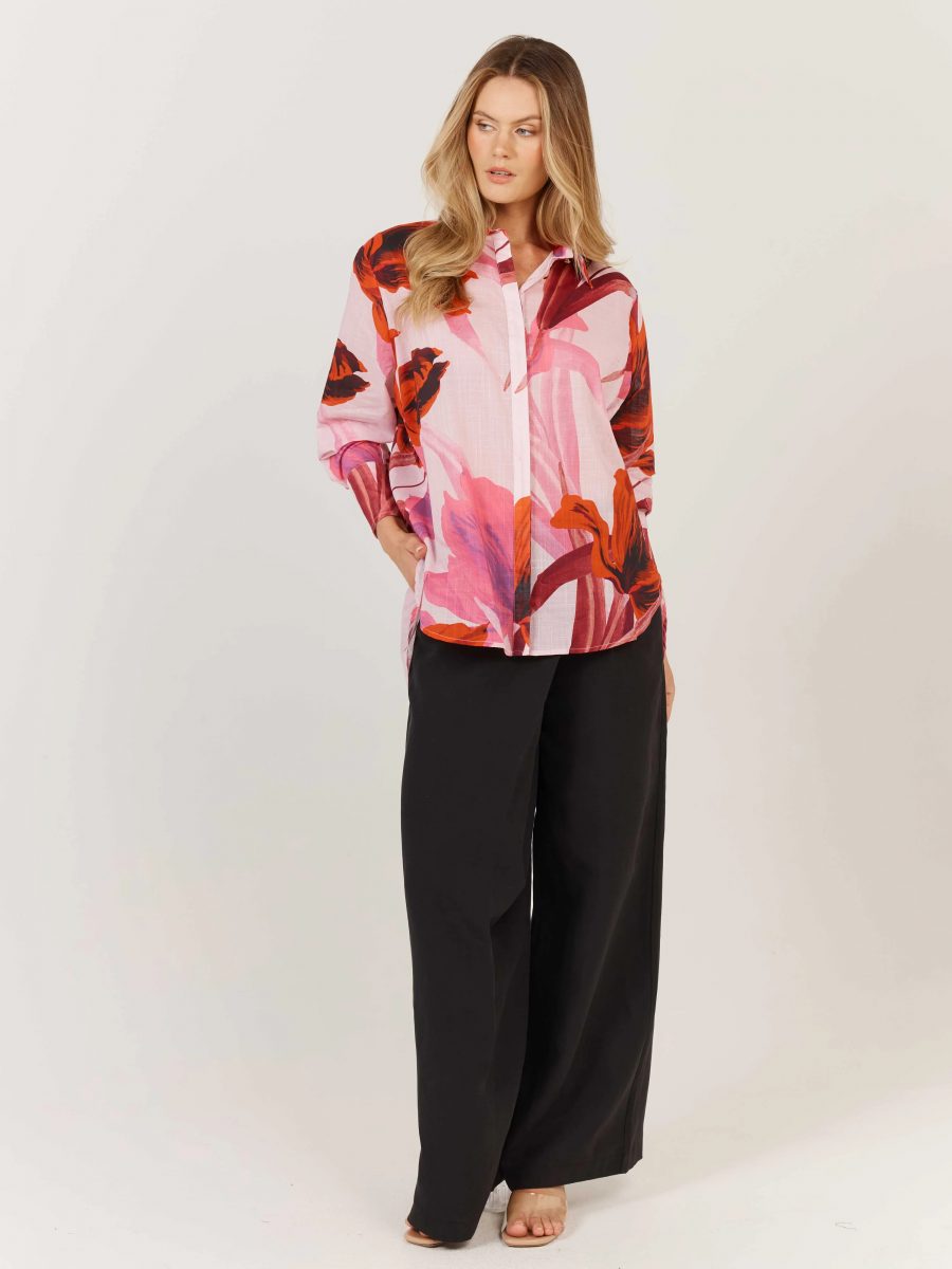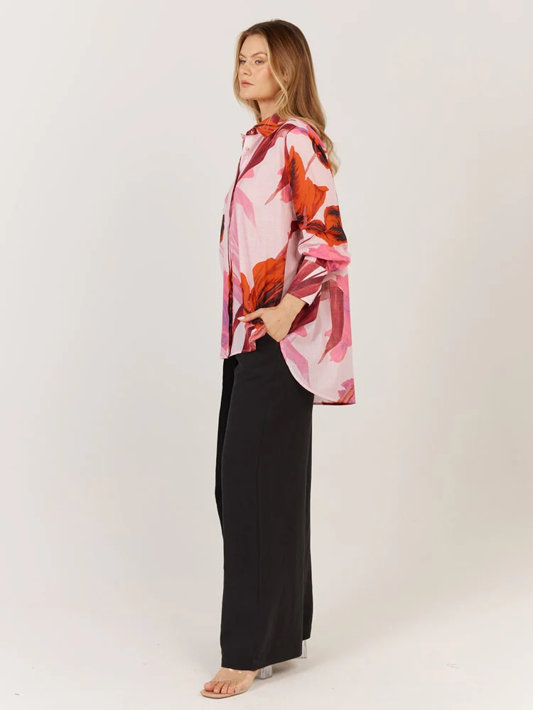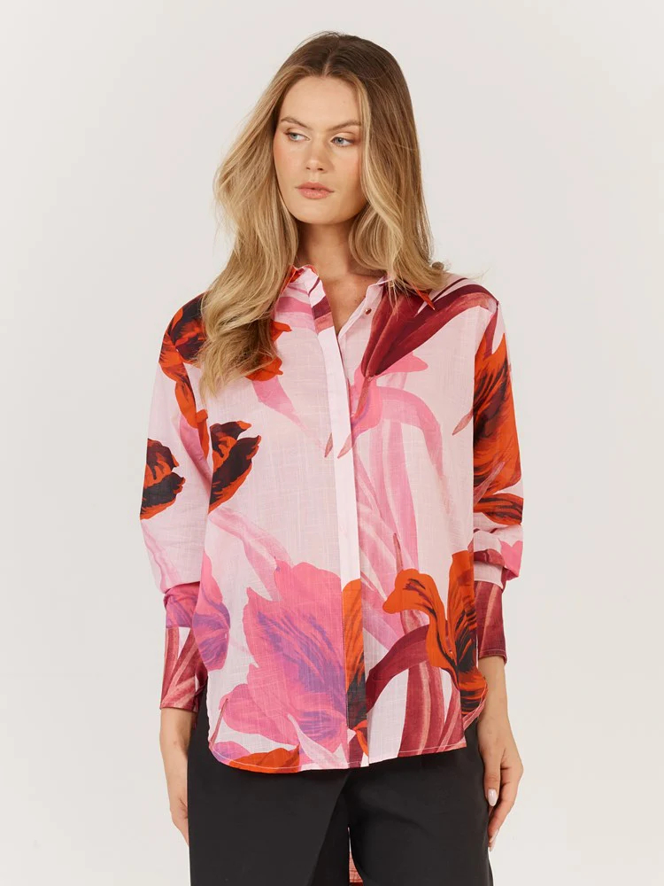The Confessions Shirt is a modern classic with a high-low rounded hem, deep cuffs, and concealed front button placket.