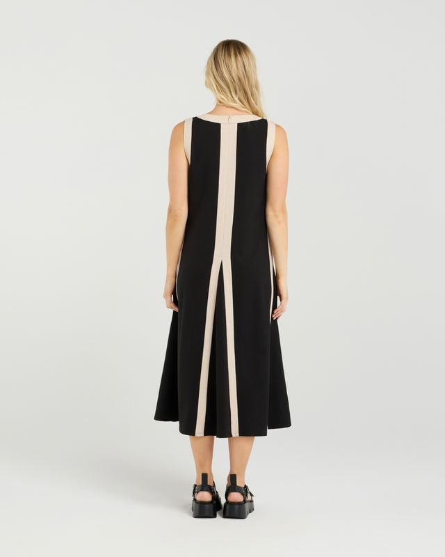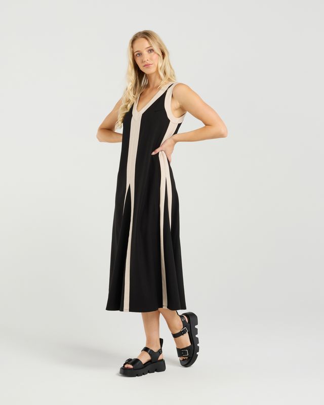 Striking in its simplicity, this sleeveless V-neck dress is designed to flatter with clean lines and thoughtfully placed contrast panels that elongate the silhouette.