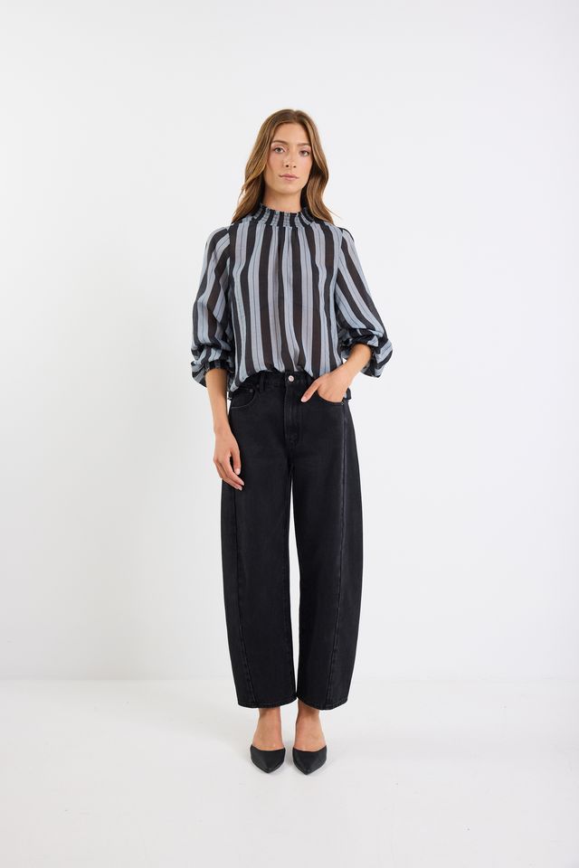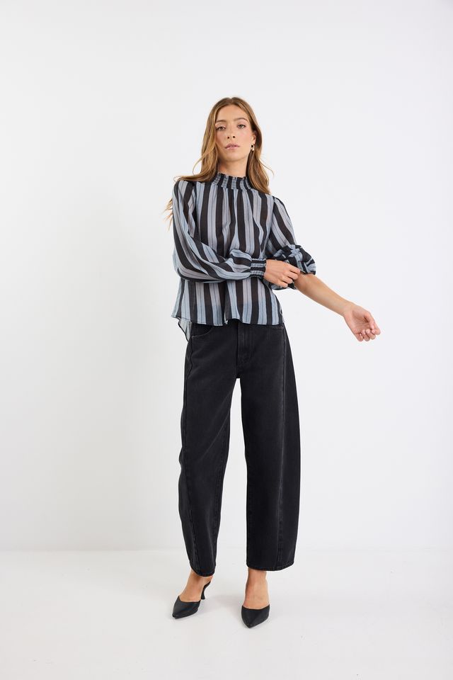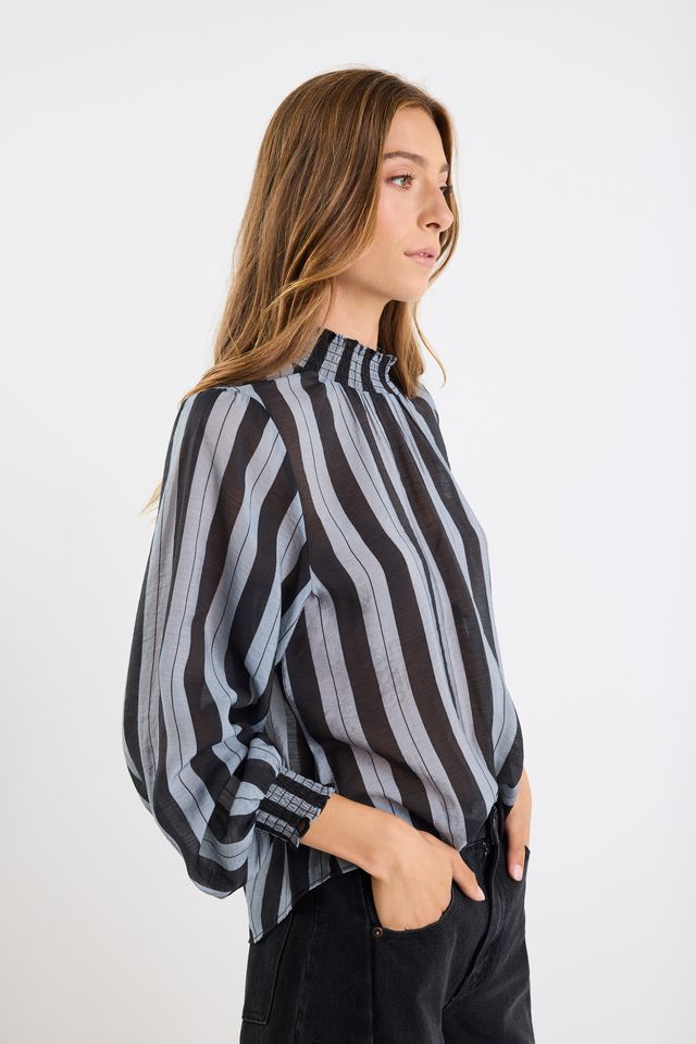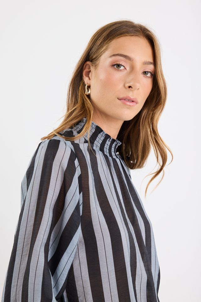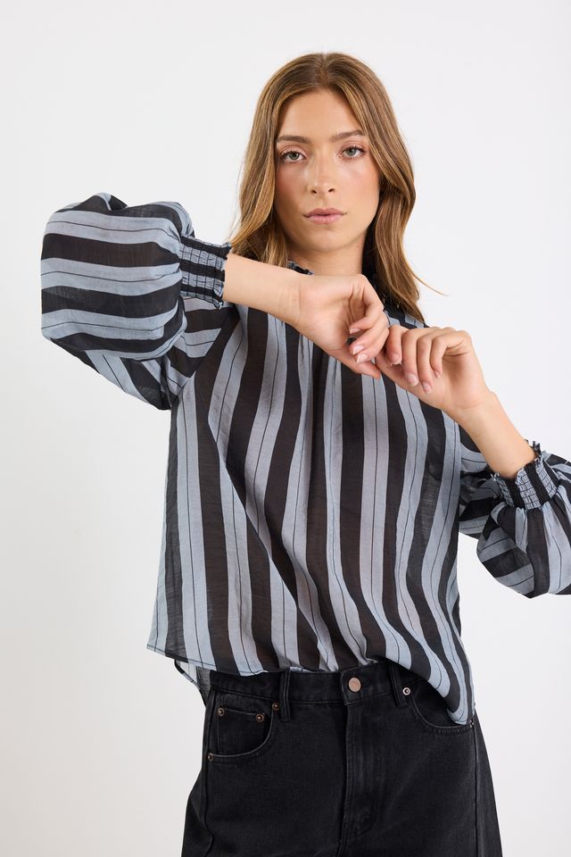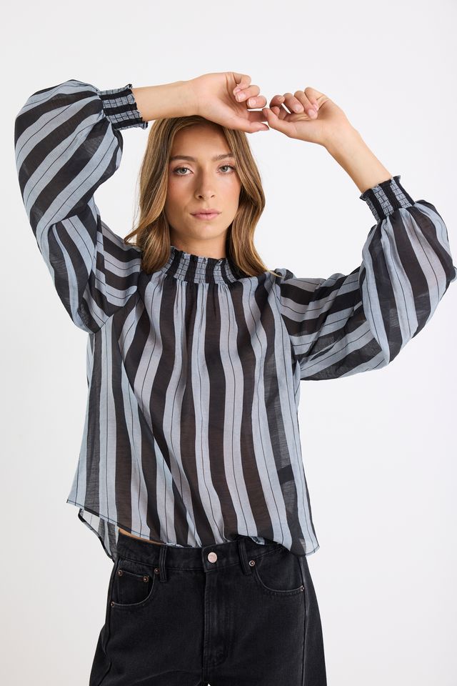 A lightweight, sheer statement blouse that combines dramatic volume with refined shirring and a contemporary stripe pattern.