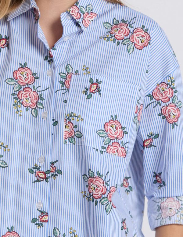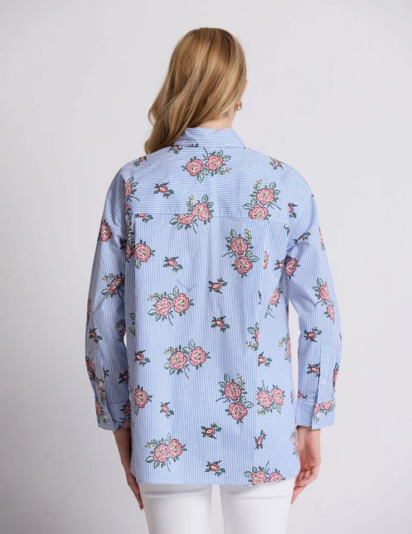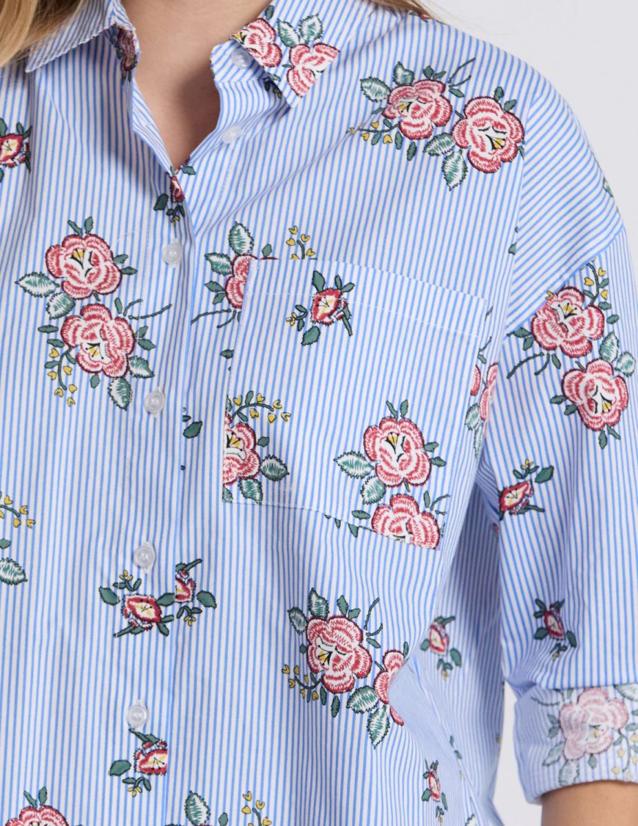 Classic collared button front relaxed fit shirt in a floral stripe, with front chest pocket.