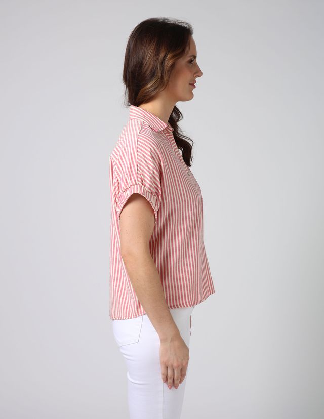 Collared v neck shirt with buttoned half placket and wide elastic cuffed finish on sleeves.