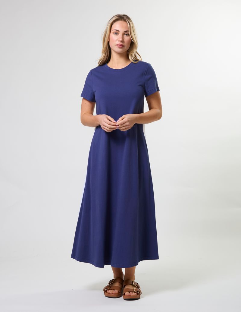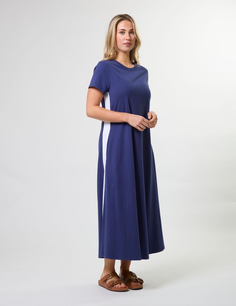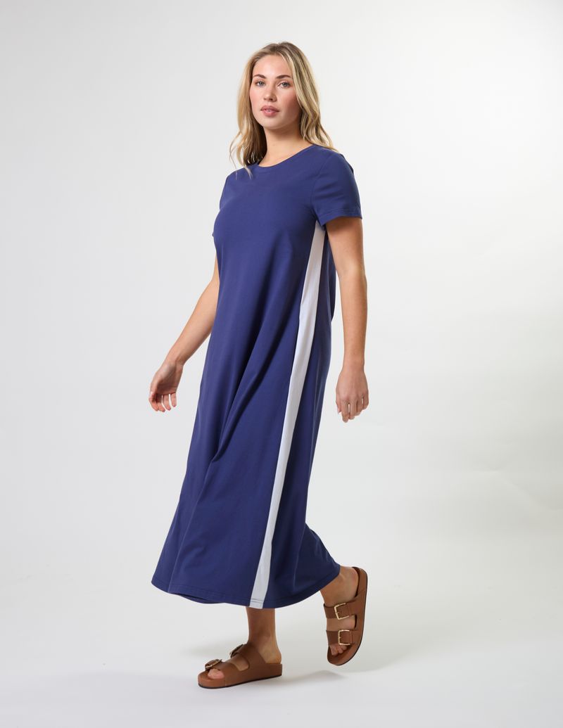 Midi length jersey knit crew neck t-shirt dress with contrast side panel insert.