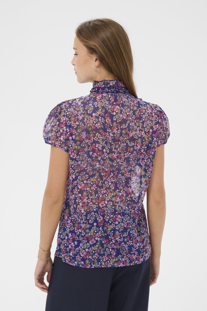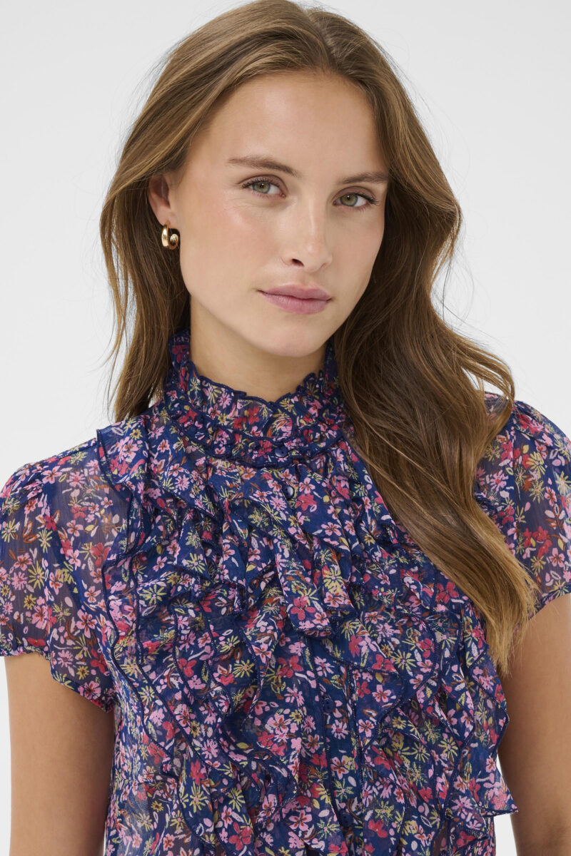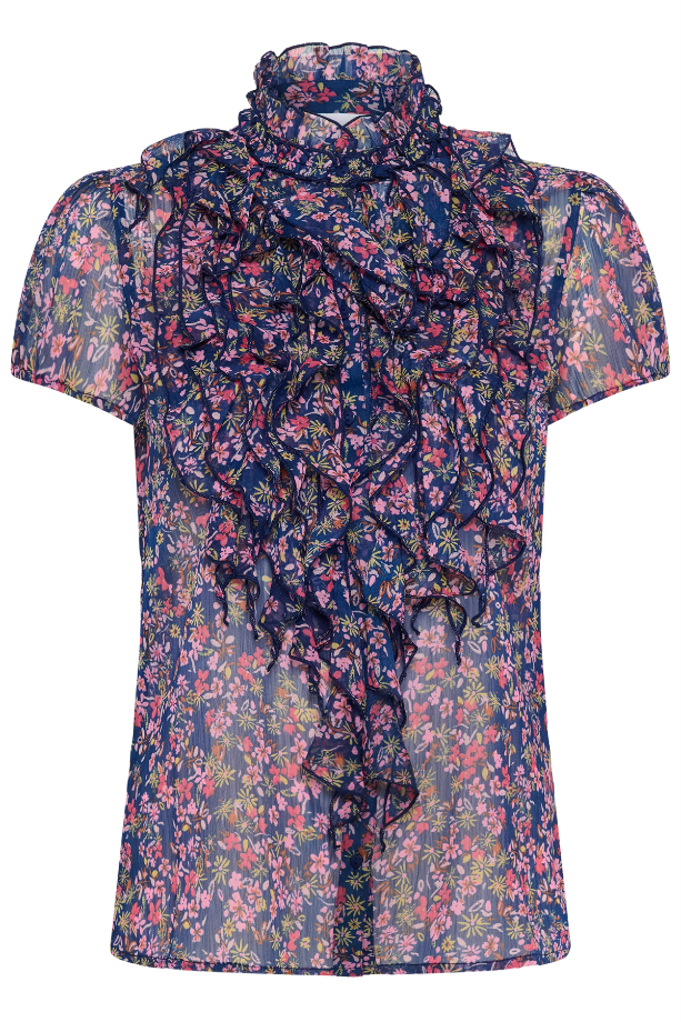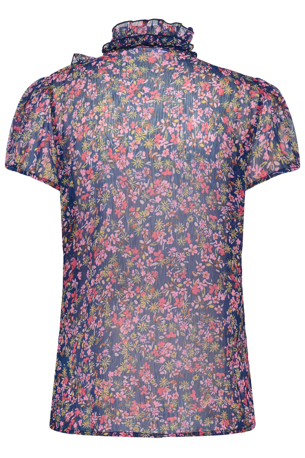 A lightweight, short-sleeve blouse in a rich navy base, scattered with a delicate multicoloured floral print. Designed with a high neckline and beautiful ruffle detailing through the front, it adds instant interest while still feeling easy to wear. The gently puffed sleeves create a flattering shape, perfect for holiday, special occasions or pop on with jeans for a stunning every day look.