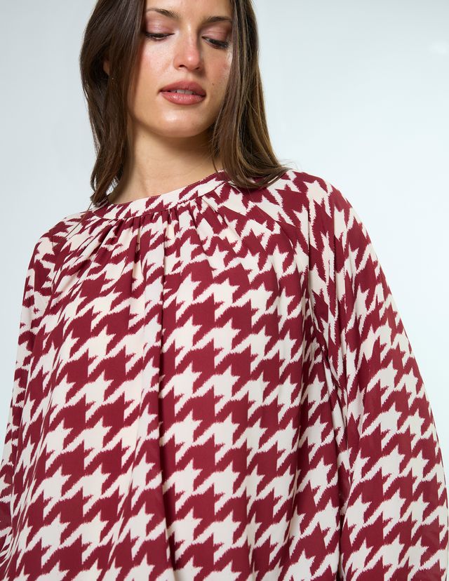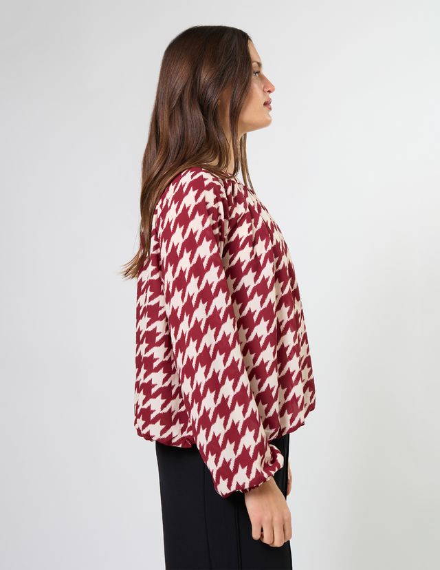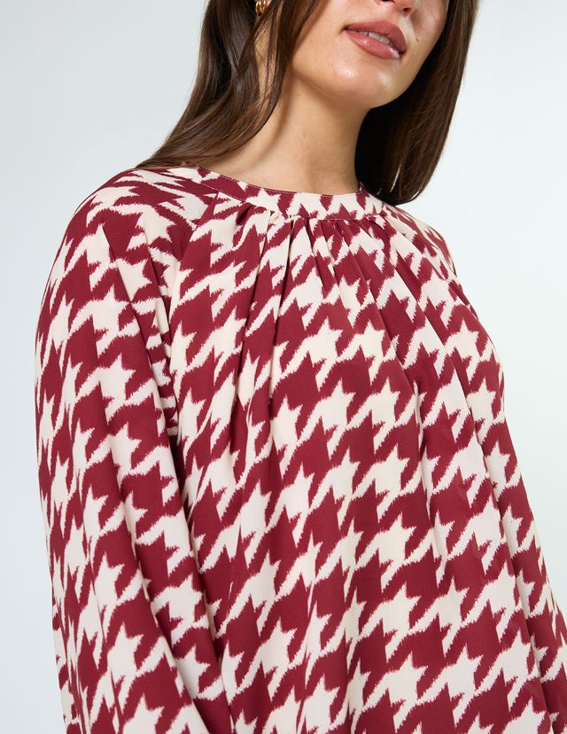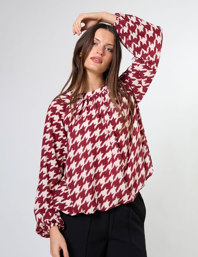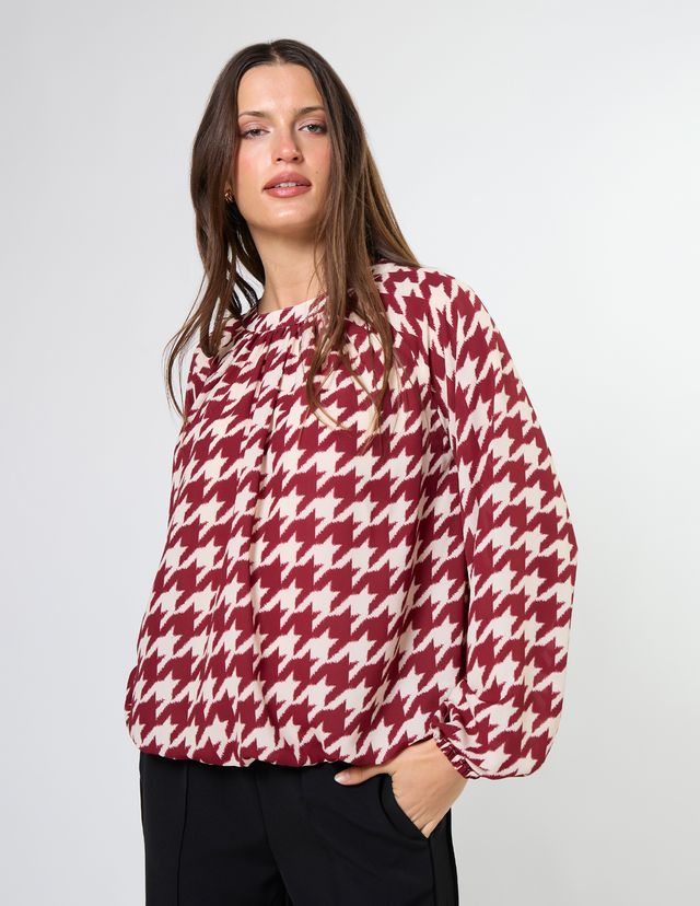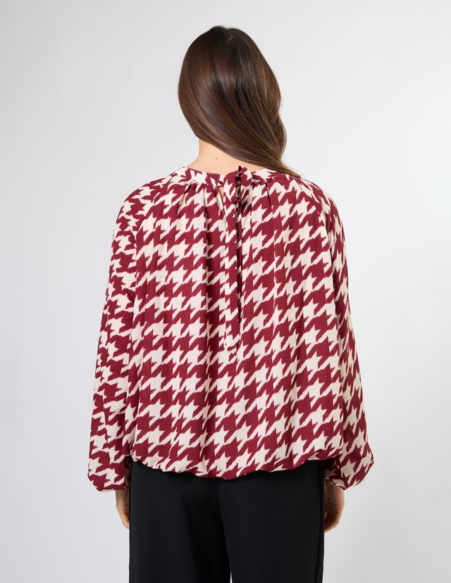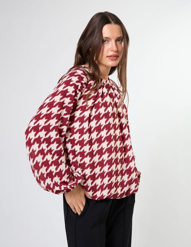 Crew neck blouse with full raglan sleeves gathered into cuffs. The hemline is turned under into a bubble hem and lined bodice.