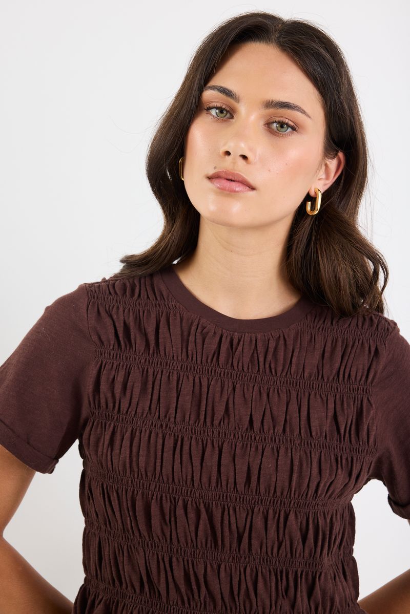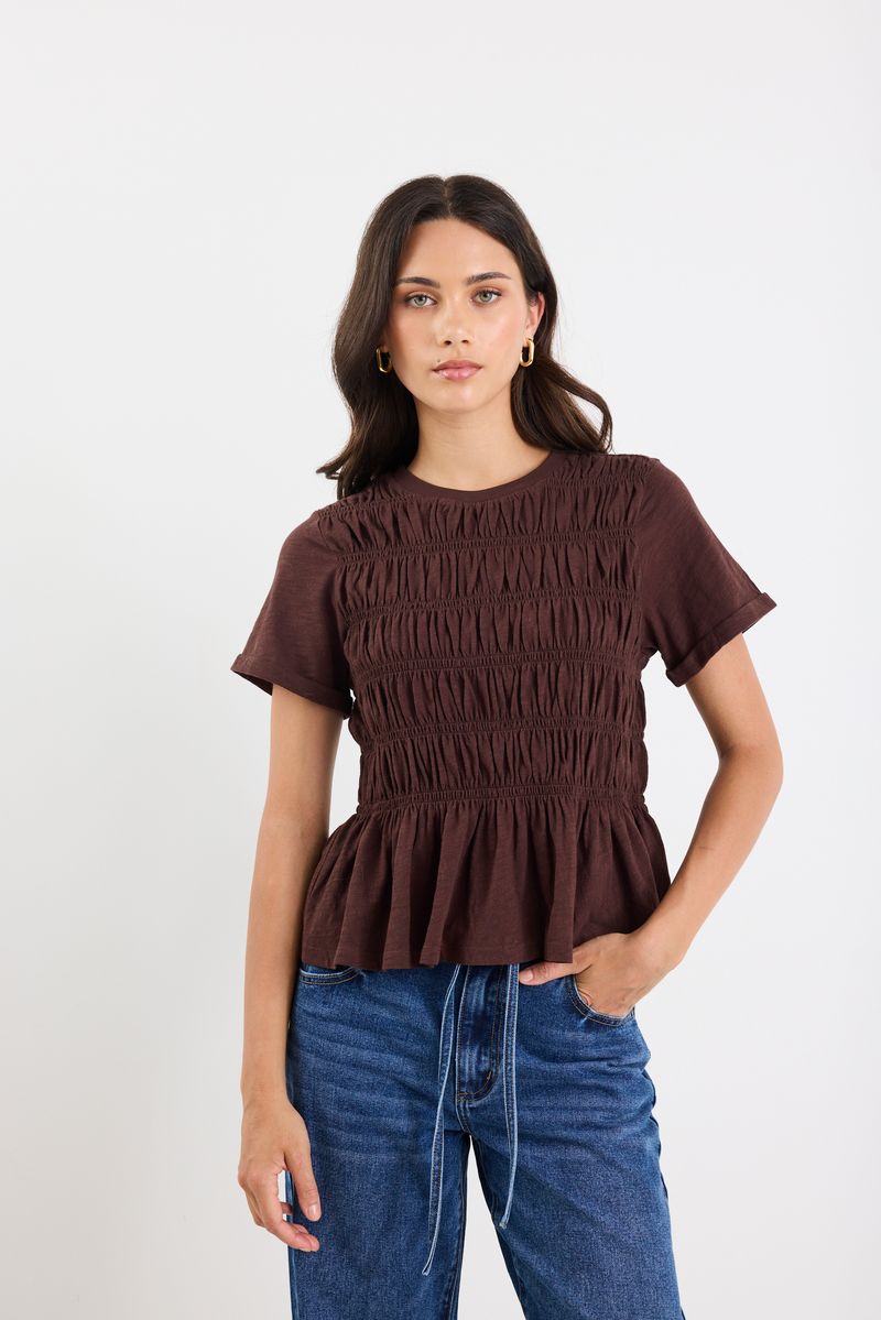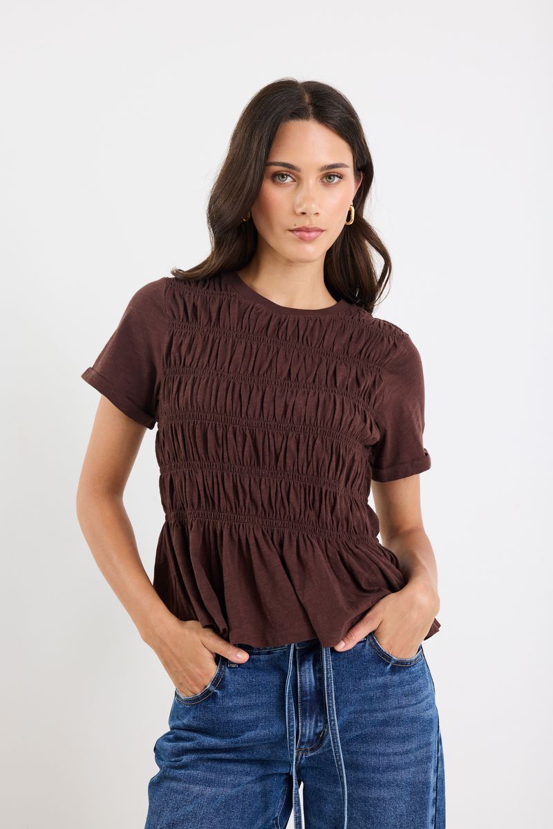 A casual tee with an elevated twist. This soft cotton top features all-over shirring that sculpts the silhouette and a gentle peplum hem for a flattering, feminine finish.
