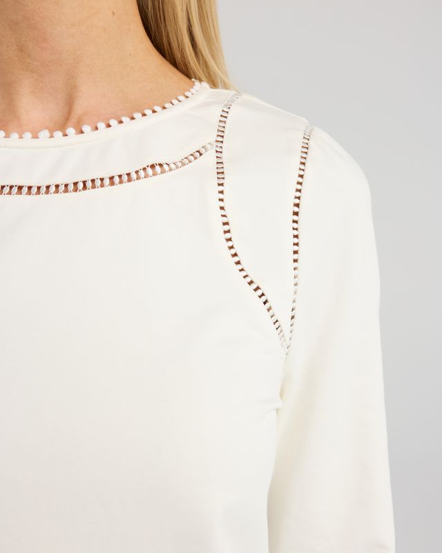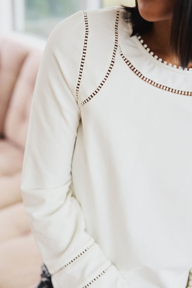 Effortlessly feminine, the Odette Top brings a fresh twist to everyday dressing. Crafted in a comfortable cotton-spandex blend, it offers soft stretch through the body while keeping a beautifully polished shape. The elasticated cuffs create a subtle blouson sleeve effect, and the delicate lace detailing adds a touch of romance without feeling overstated.