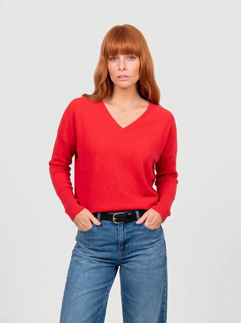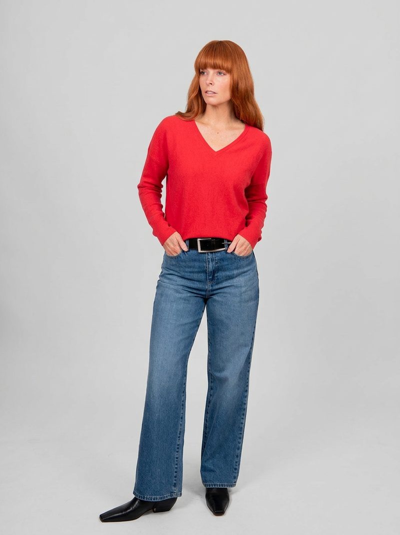 Elevate your style with our Princess Vee Curved Hem Pullover. The slimline shape is accentuated by a flattering V-neckline and gentle curved hem, finished with full-length rib sleeves for a polished yet effortless look. Crafted from our signature merino cashmere yarn, this super-soft knit offers a shorter hip-length silhouette designed for versatile everyday styling.