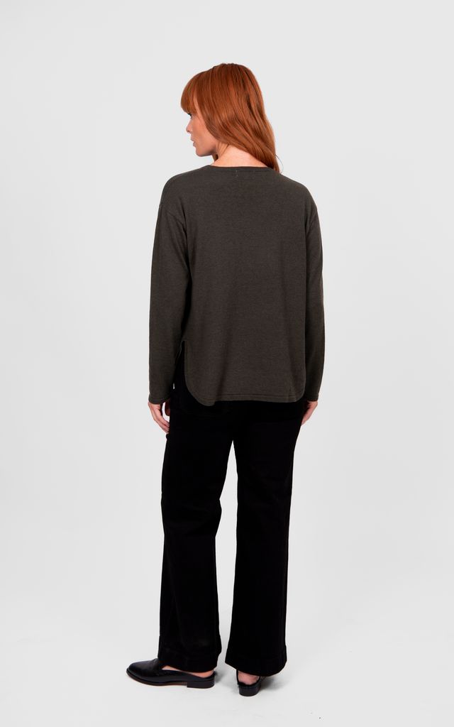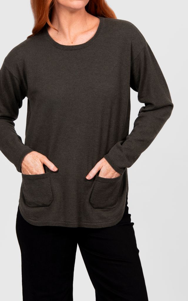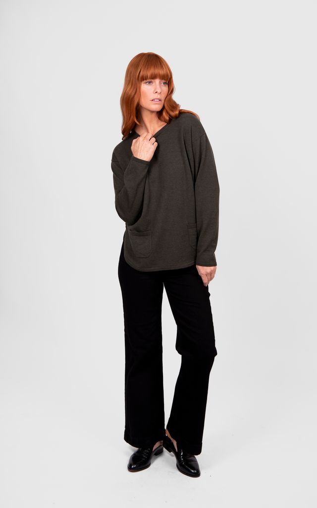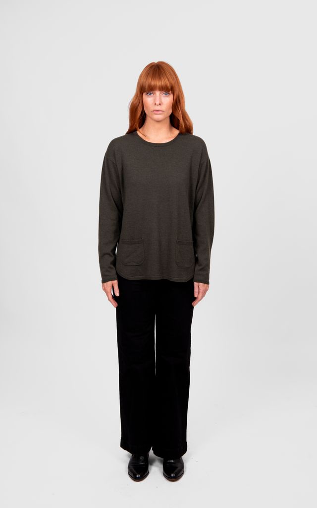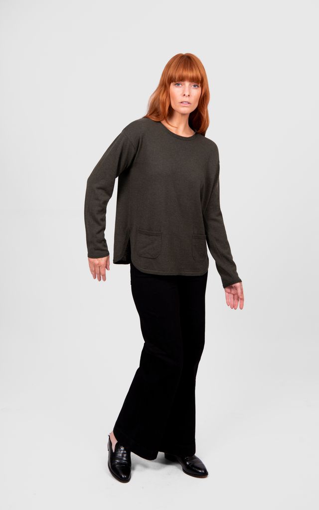 Relaxed Curve Hem Pullover W/Pockets – Olive