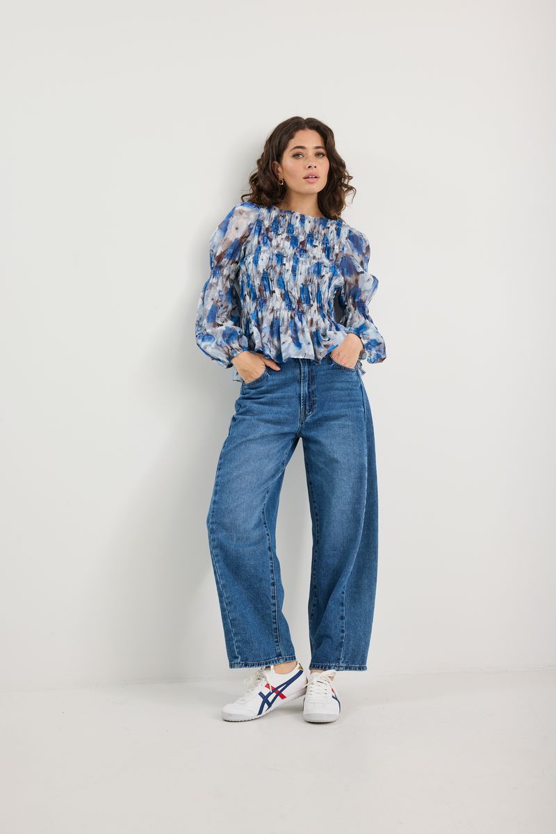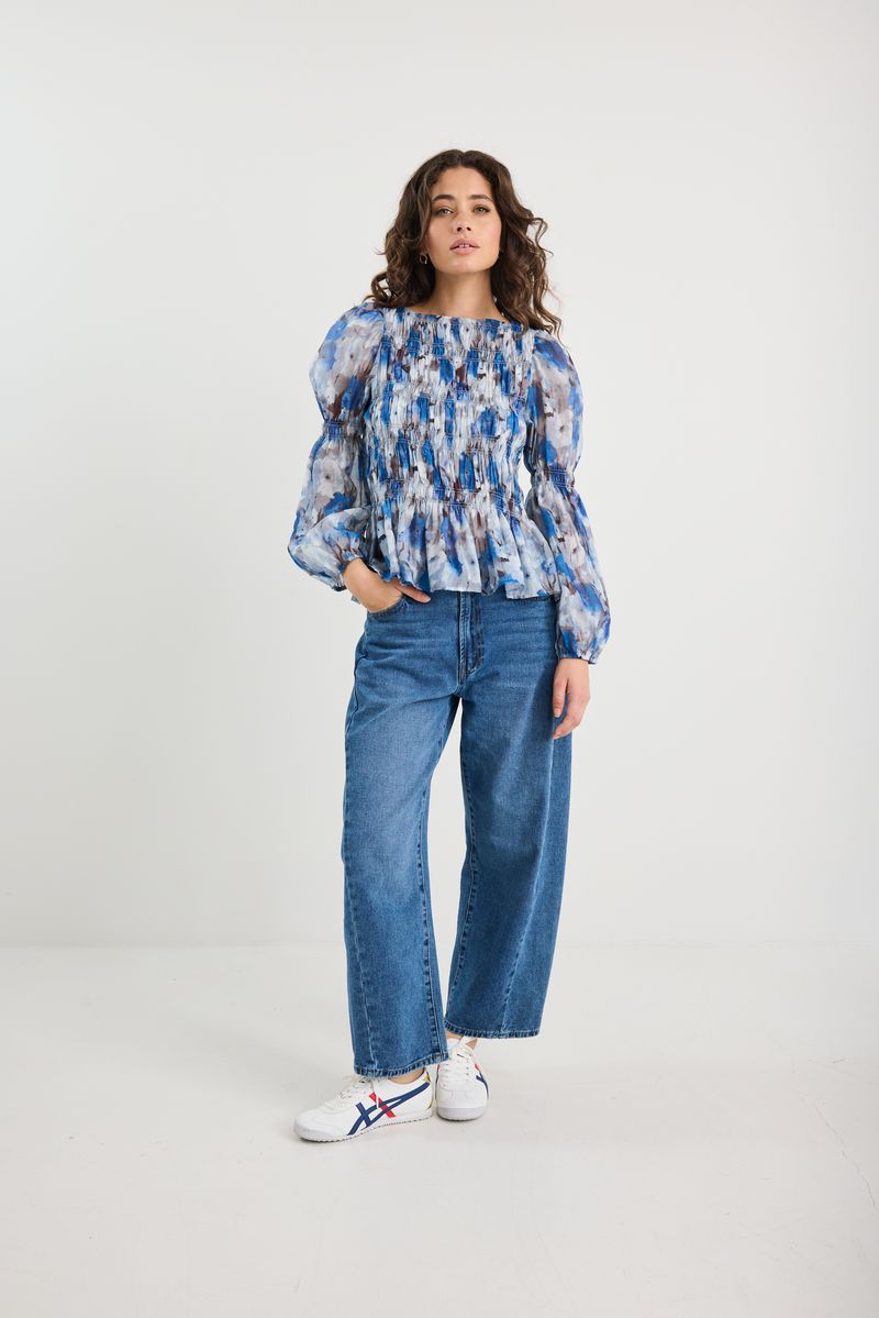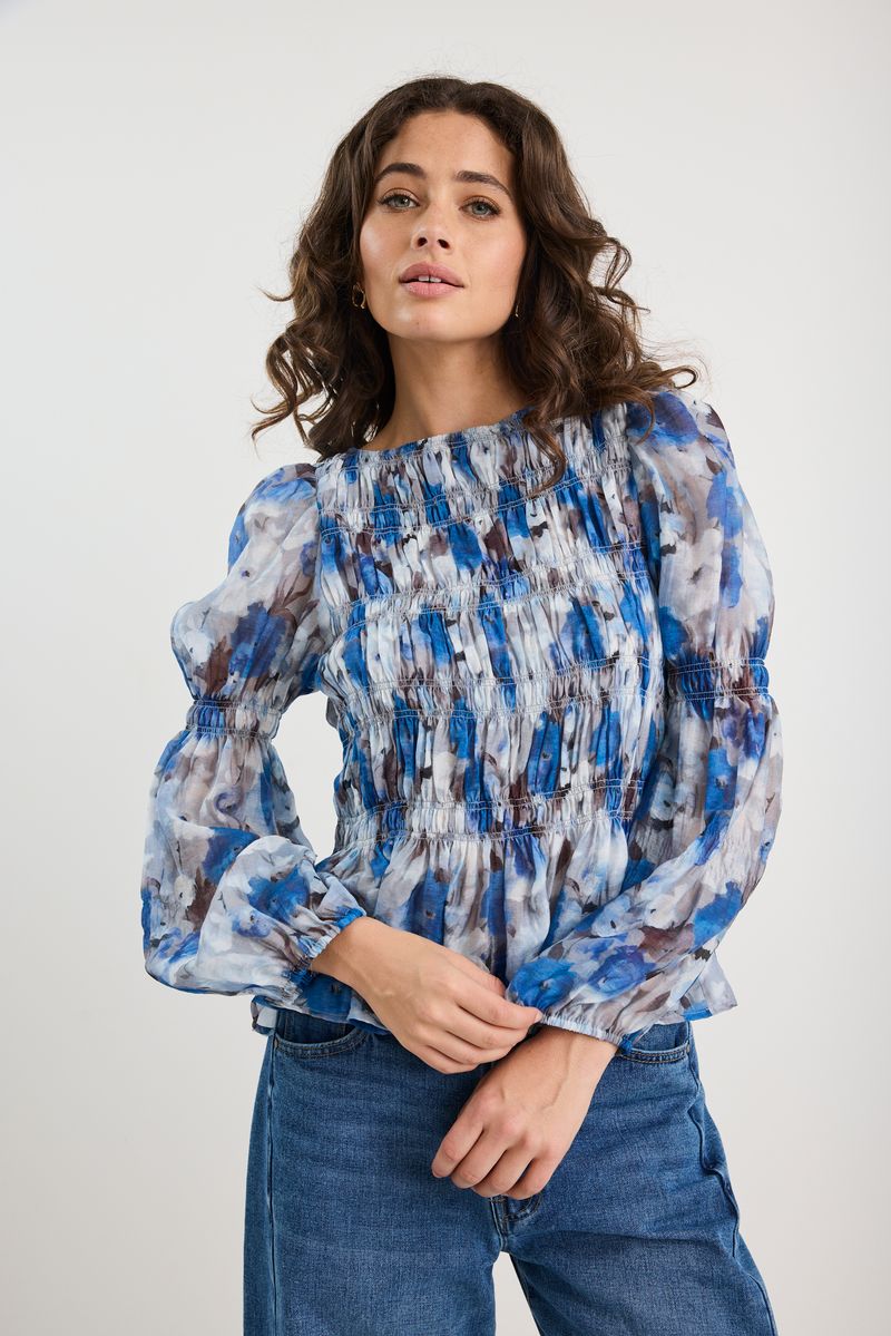 Printed in expressive sky blue florals, this long sleeve top brings a romantic yet modern mood. Designed with a softly structured silhouette, it features an all-over shirred bodice for texture and shape, with lightly puffed sleeves and elasticated cuffs to finish. Light, floaty, and full of character.
