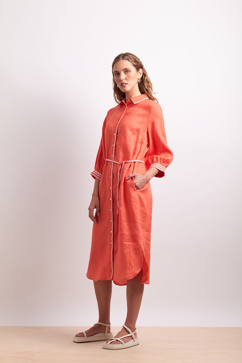 Tailored with a playful twist, the Ric Rac Shirt Dress has contrasting zig-zag piping added as a playful feature on this classic silhouette. Crafted from 100% linen, it features a collar, pockets, a curved hemline, ¾ sleeves with gathered cuffs and a tie on the waist. The dress buttons all of the way through with mother of pearl buttons and could be worn open as a duster. Designed in Christchurch, New Zealand.