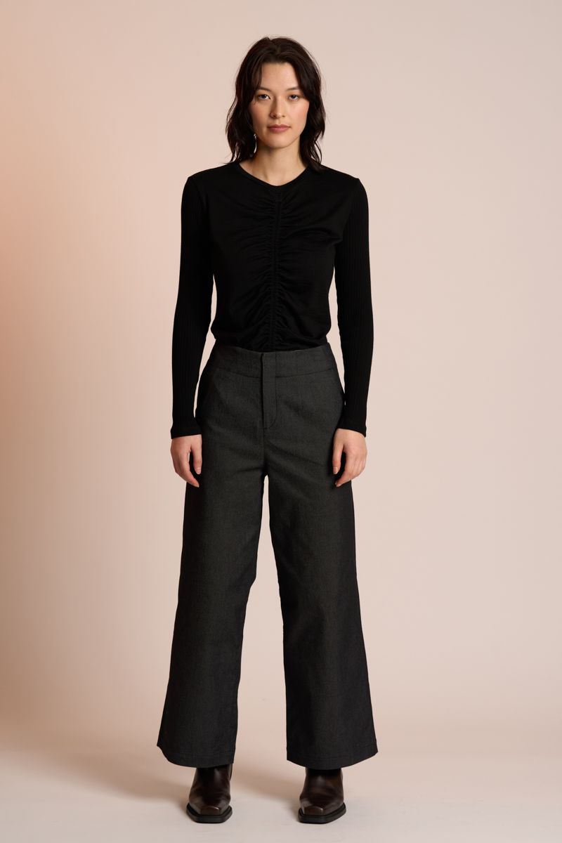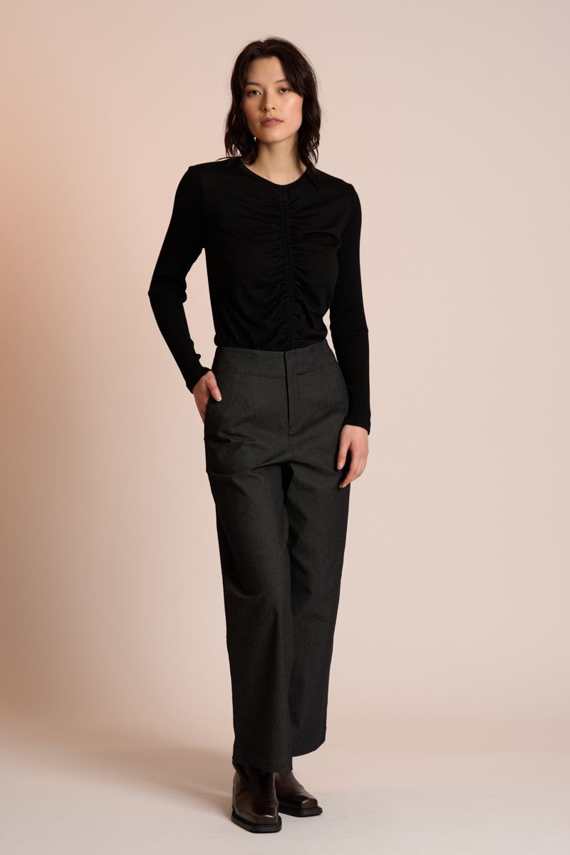 The Rouched Top by Neris ia an elevated base layer crafted from 100% merino wool. Designed as a form-fitting silhouette, it features a crew neckline and a centre-rouched detail. The long sleeves are made from a fine merino rib, offering comfort and refined contrast. A stylish, versatile layer that pairs perfectly with skirts, trousers or effortlessly with denim.