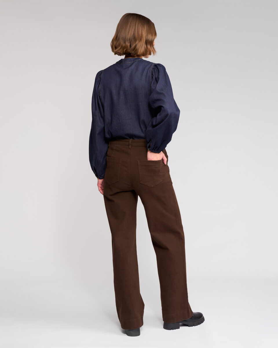 Full-length wide-leg jean in Chocolate, a dark brown. Designed with feature patch pockets on the front.