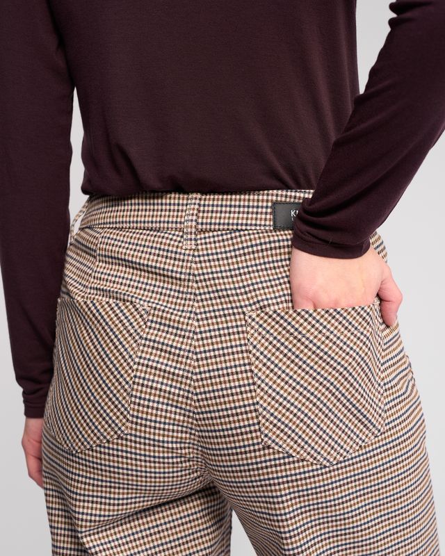 Full-length wide-leg pant in the Paige pattern, featuring a cream base with a checked pattern in cedar, blue, raisin, and brown. Designed with front and back patch pockets, this style offers a relaxed silhouette with a classic, tailored finish.