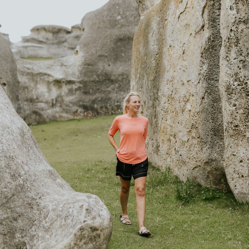 With its relaxed cut, the Ruby skims in all the right places, while the elegant boat neckline draws the eye upward and balances the shoulders. Elbow-length sleeves provide confident arm coverage, and the gently curved hem softens the silhouette for a flattering finish.