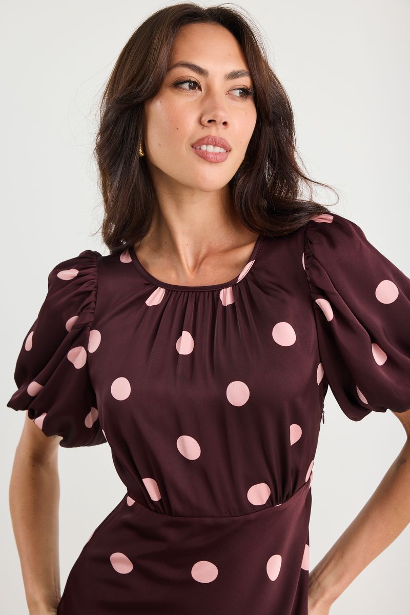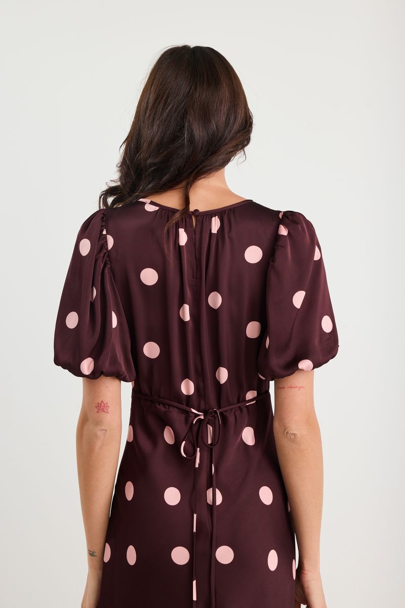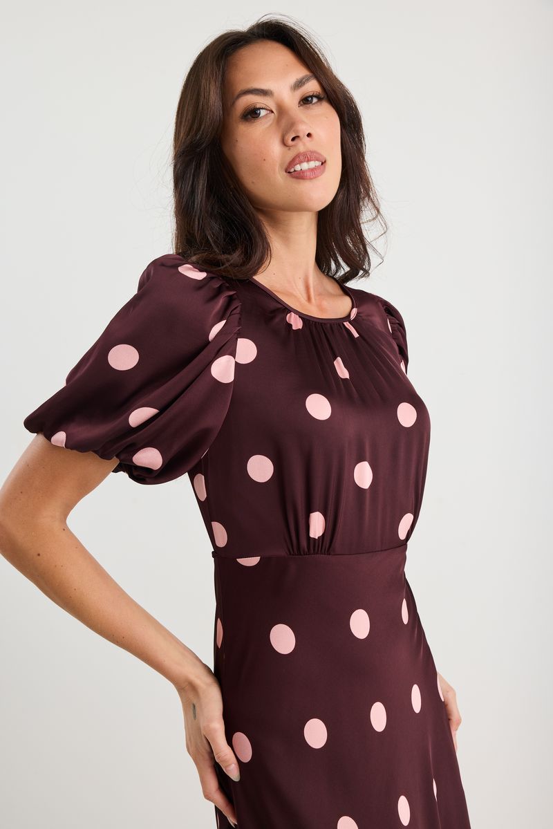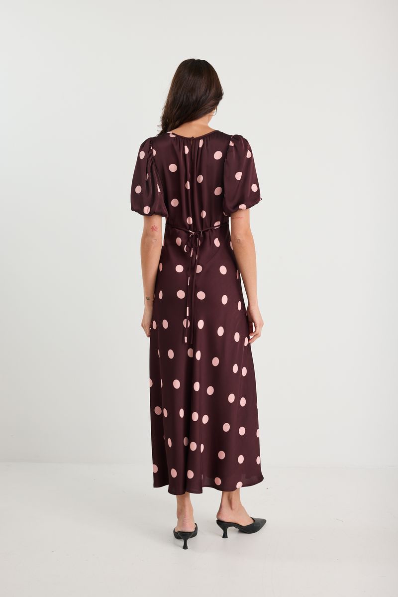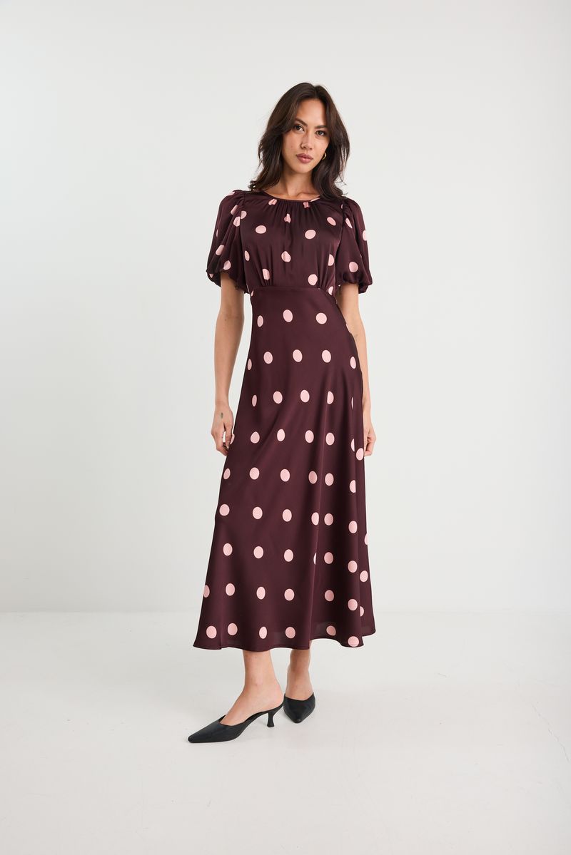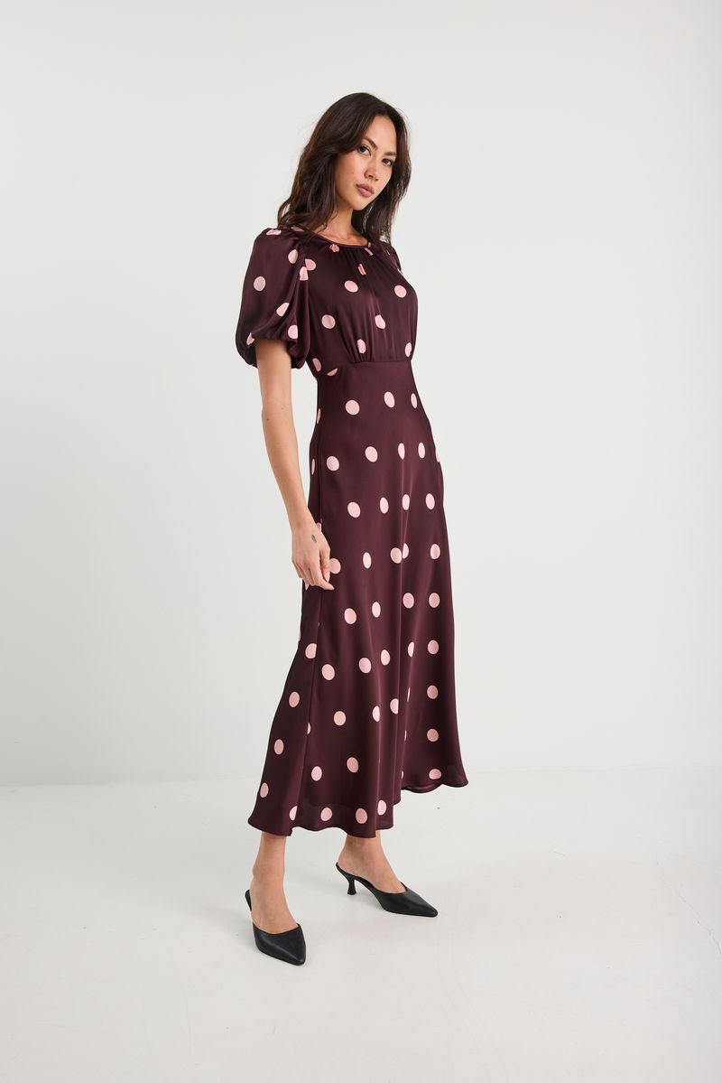 The Stage dress is pure joy in outfit form, it’s playful, polished, and guaranteed to lift your mood. With its soft satin drape, puff sleeves, and dreamy bias-cut silhouette, this one moves with you in all the right ways. The blush polka dots against rich plum? A total scene-stealer.