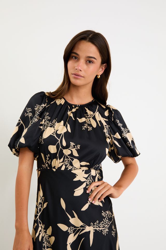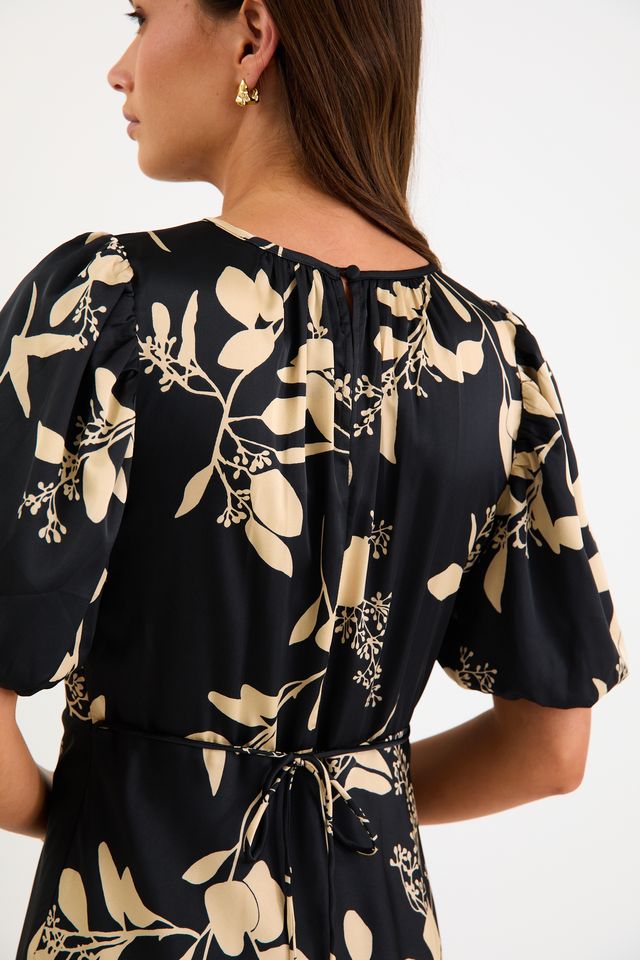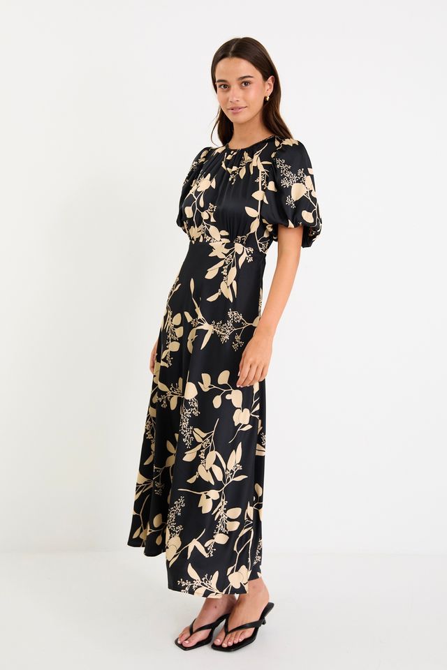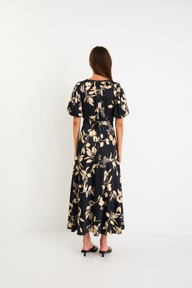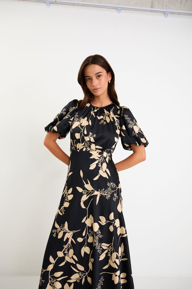 Stage Satin Puff Sleeve Floaty Maxi Dress – Black Beige Floral