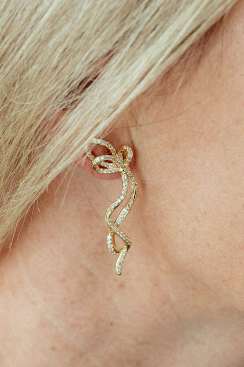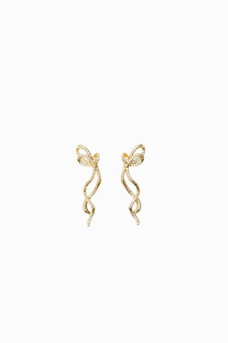 Gold plated stud earrings in cascading bow shape with inlaid cubic zirconia