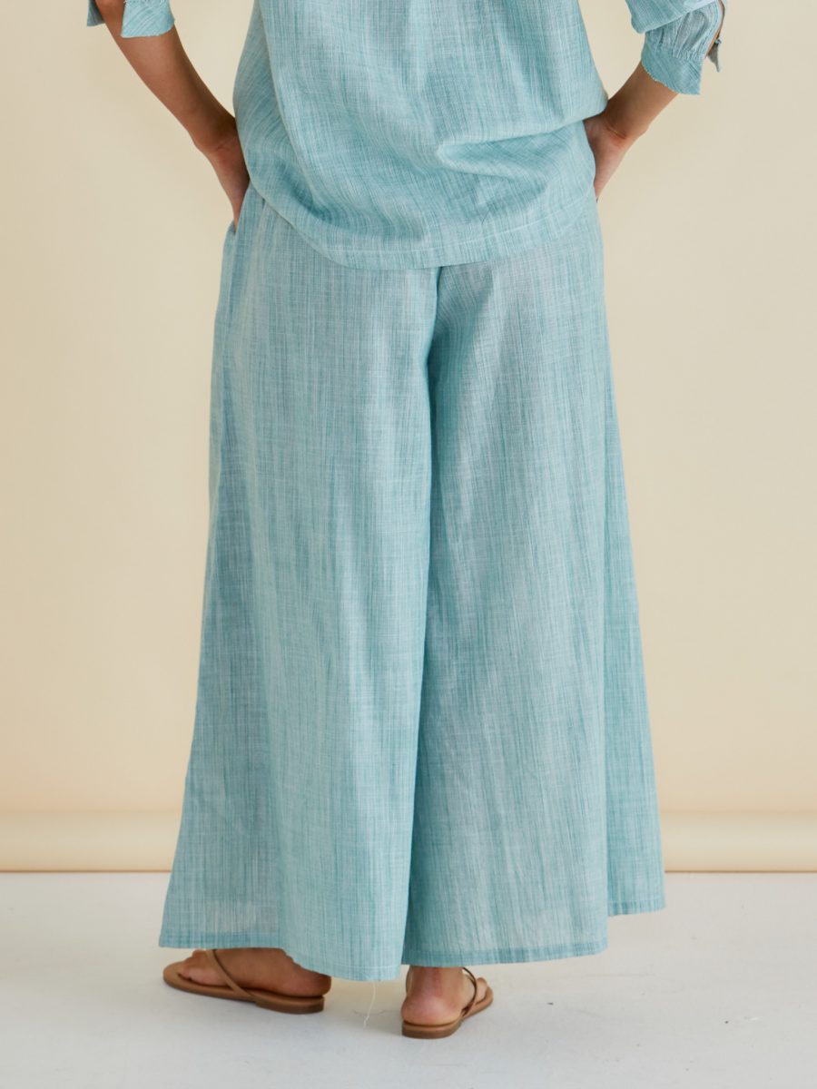 The Tatum Wide Leg Pant features handwoven cotton fabric with an elasticated waistband and wide palazzo leg. Practical pockets and mid-high rise create an elevated, comfortable silhouette. A classic, easy-to-wear pant ideal for transeasonal wardrobes.
