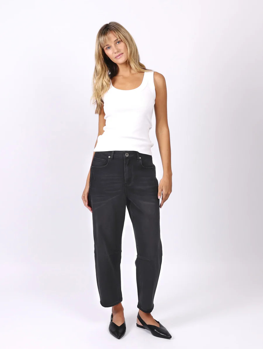 Step into the spotlight with these Monaco Toni Barrel Jeans, where classic black denim meets avantegarde silhouette for truly head-turning results. These beauties feature a sleek fitted waist with no-nonsense zipper fastening that creates a flattering line before dramatically flaring into that signature barrel shape around the mid-leg. The clever tapered finish at the bottom balances the bold middle perfectly, creating a silhouette that’s as flattering as it is fashion-forward.
