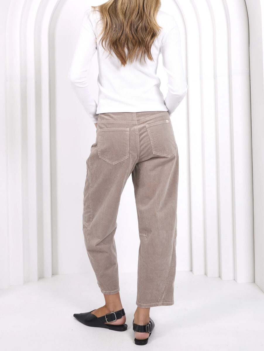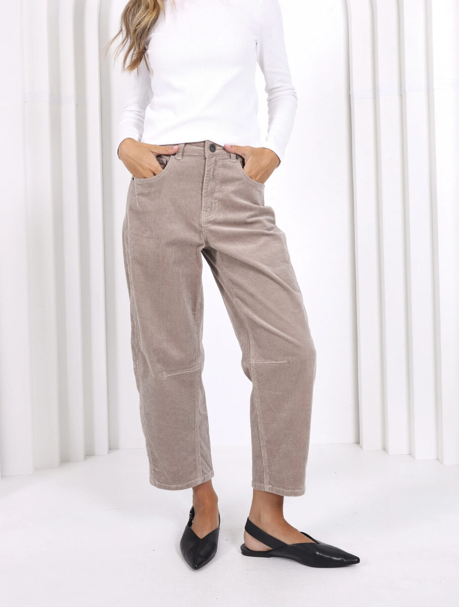 On-trend barrel jeans crafted from plush corduroy with a soft, cozy feel. Designed with a relaxed fit, they feature classic front and back pockets for everyday ease. The barrel shape flatters all body types while keeping your look modern and effortless.