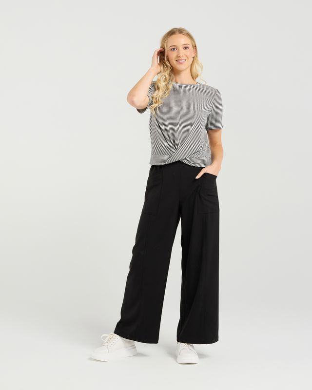 A must-have top for summer, perfect back with denim, high waisted wide leg pants, and trendy midi-skirts. Made out of Cotton blend rib knit and featuring round banded neckline, and a flattering twisted detail on the front, this is sure to become your go-to tee for summer.