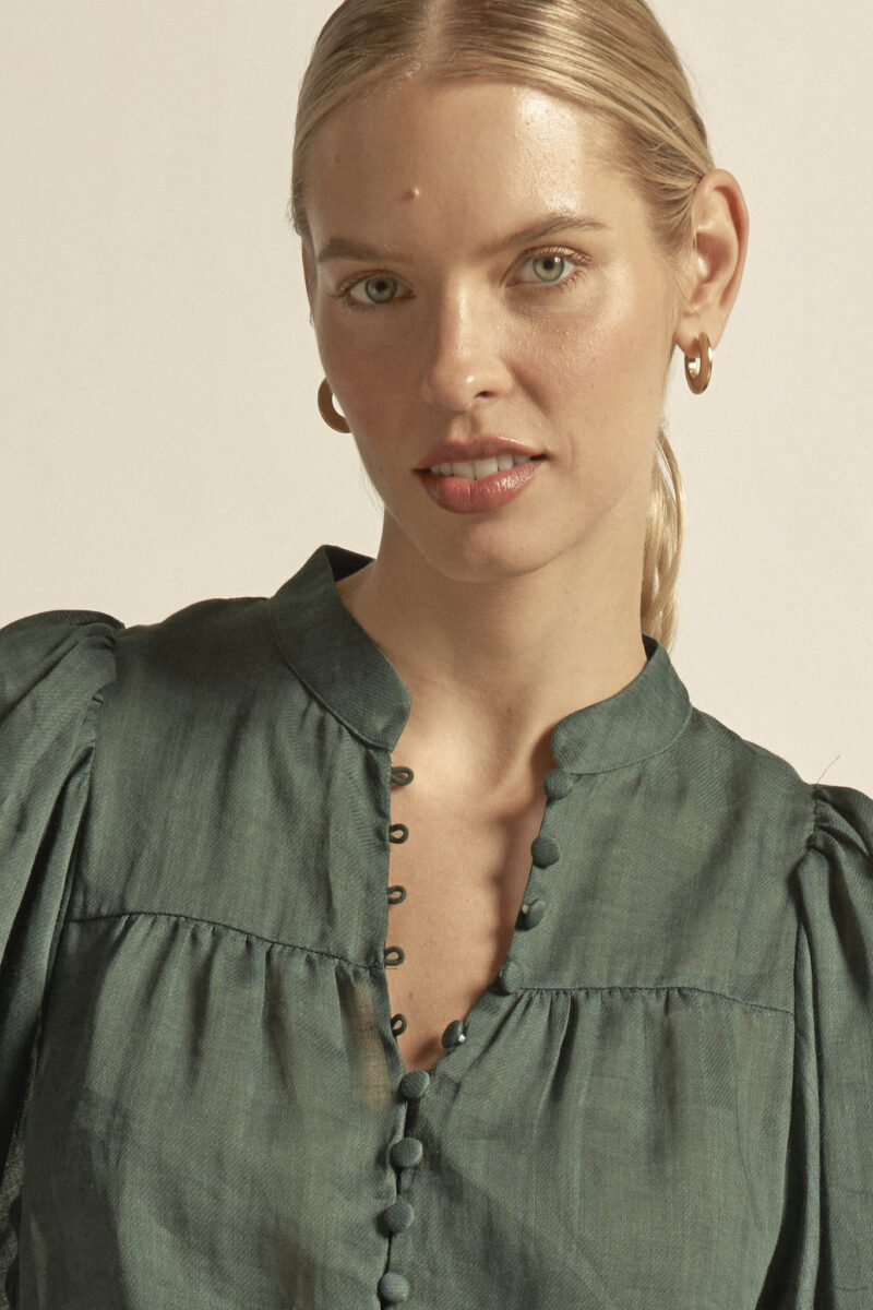 · blouson sleeves finished with a deep cuff for sculptural shape