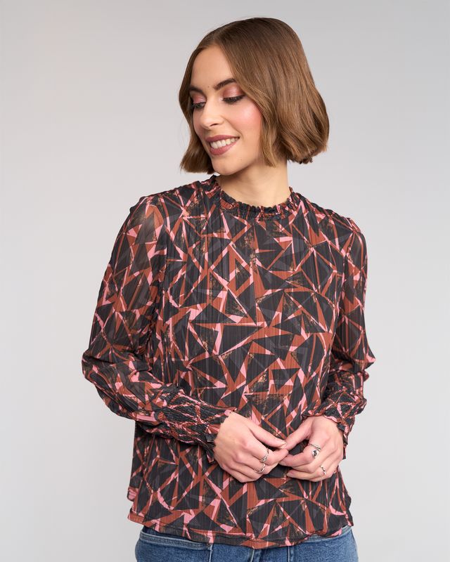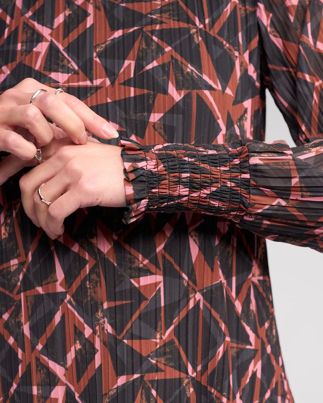 Long sleeve mesh top in the Dusk print, a bronze coloured base with black and light pink geometric shapes. Made from stretchy crinkle fabric with a lined body for coverage. Featuring a shirred high neck and long sleeves that gather into ruffled cuffs.