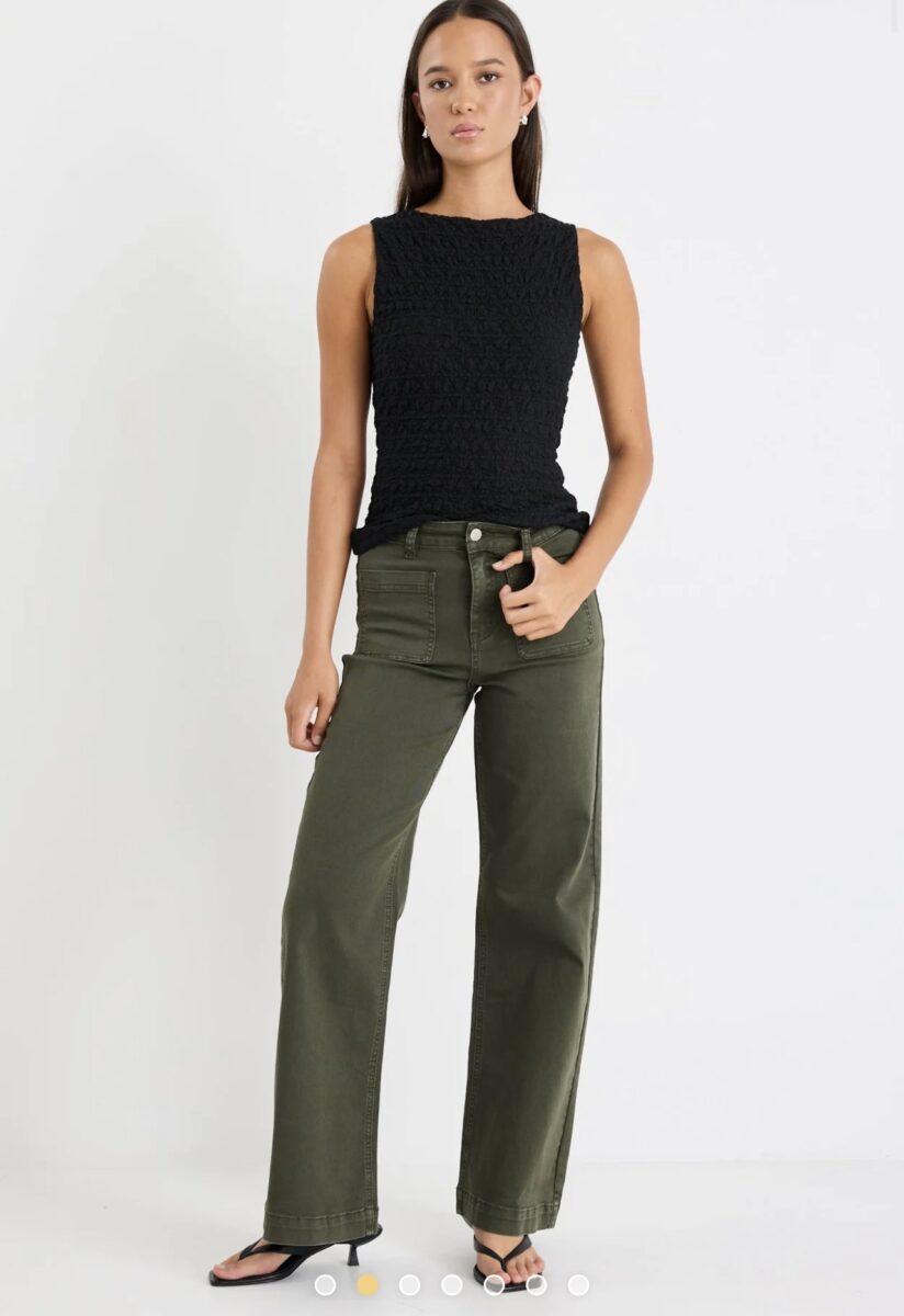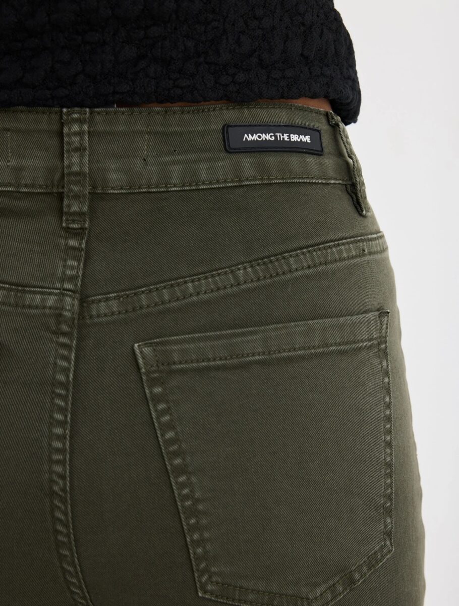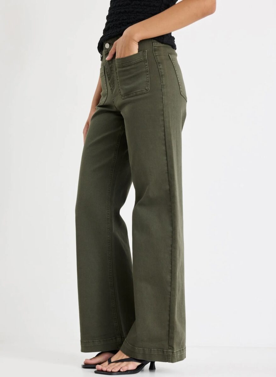 The Zoey Dark Khaki High Rise Wide Leg Pocket Jean from Among The Brave is made from stretch denim with a high-rise waist and wide-leg shape. It includes front pockets and a zip closure for a secure fit. Pair with neutral tones for an effortless, earthy look.
