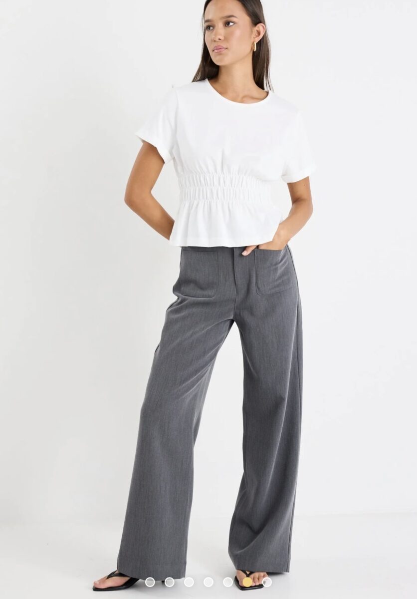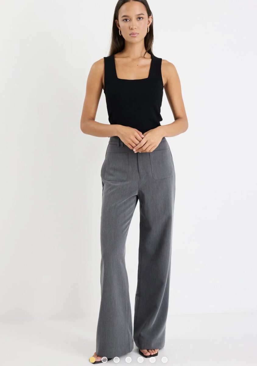 The Zoey Tailored Charcoal High Rise Wide Leg Pocket Pant from Among The Brave is made from recycled fabric with a structured finish. It features a high-rise waist, wide-leg cut, square front pockets, and belt loops witha zip closure. Style with a tucked in shirt for a sharp look.